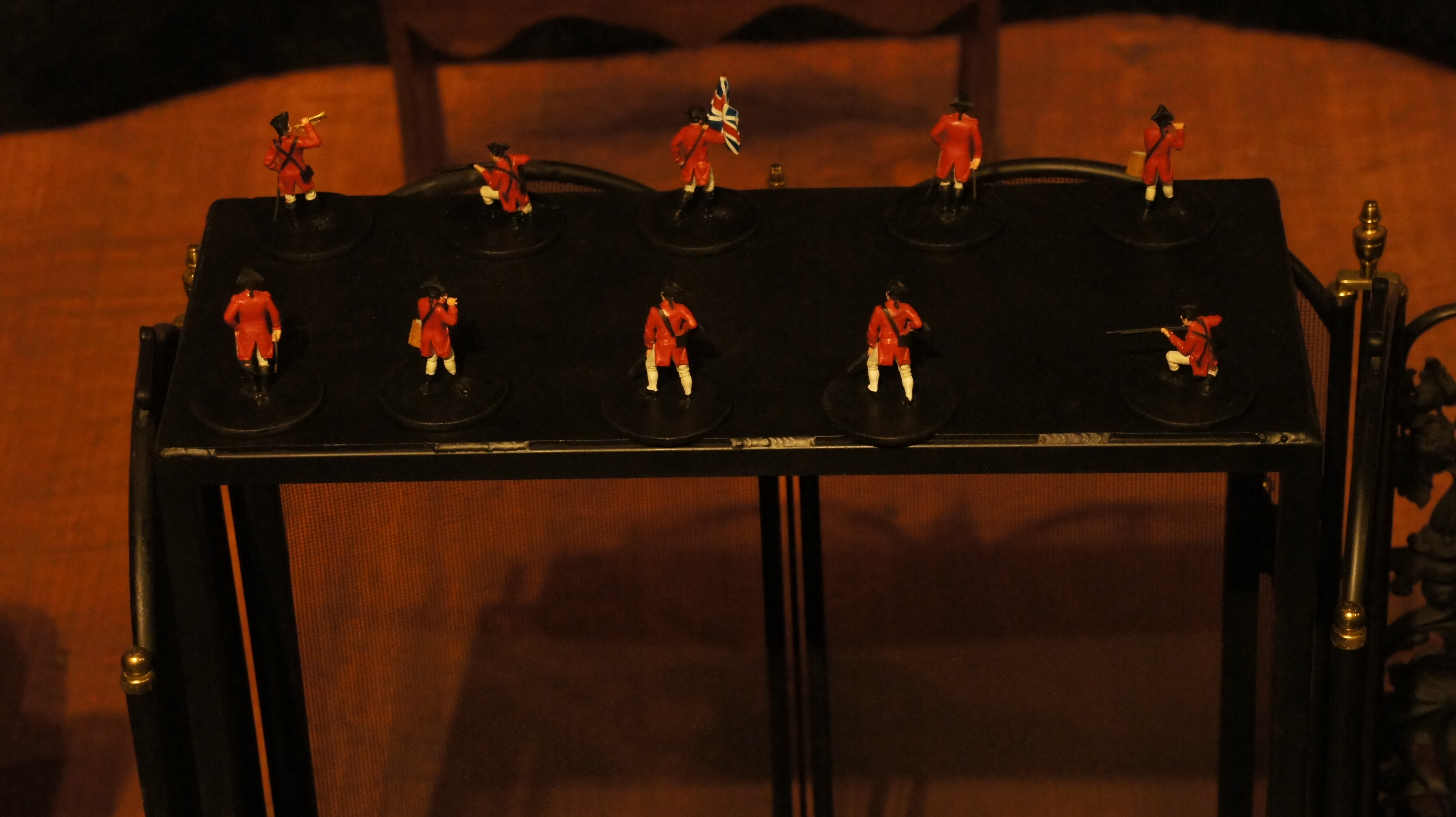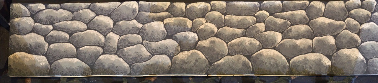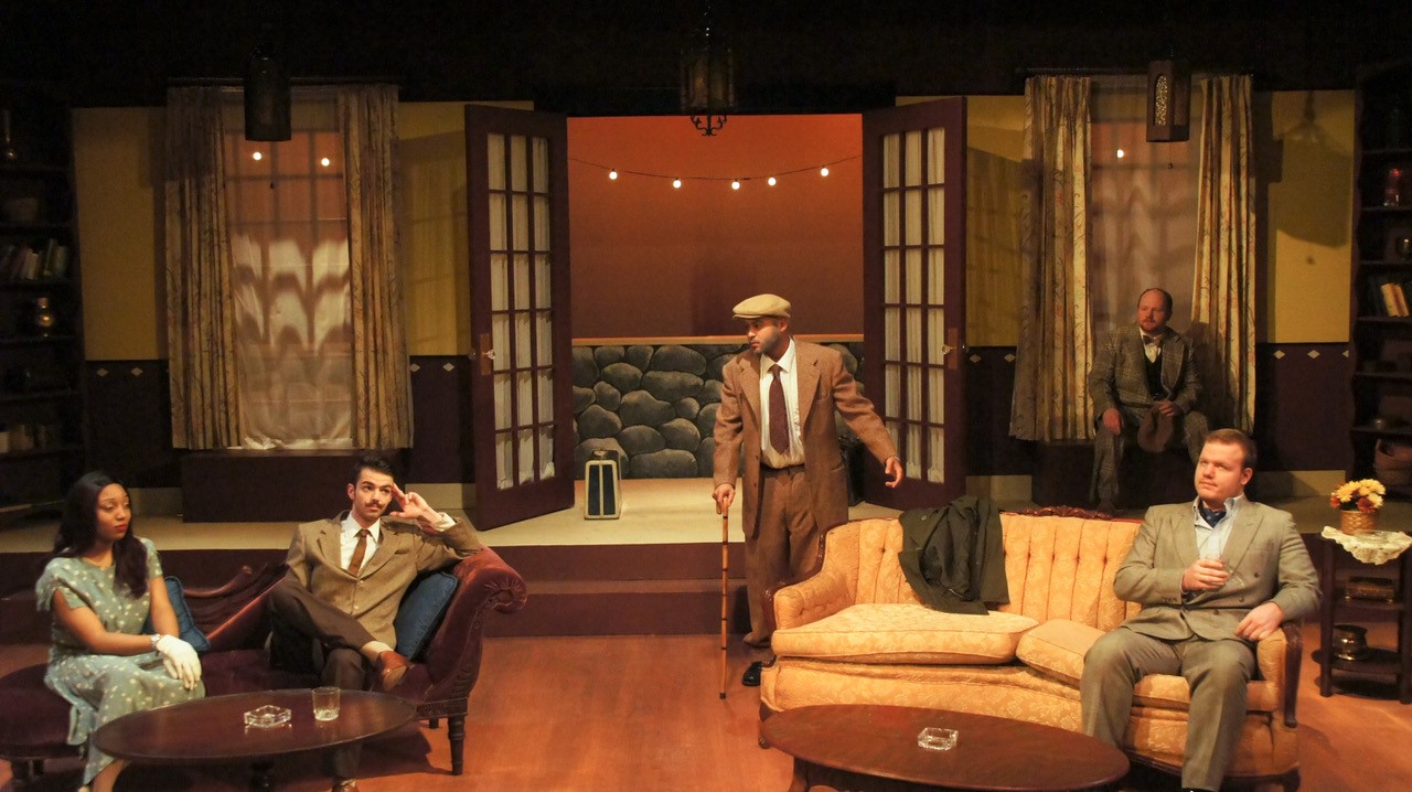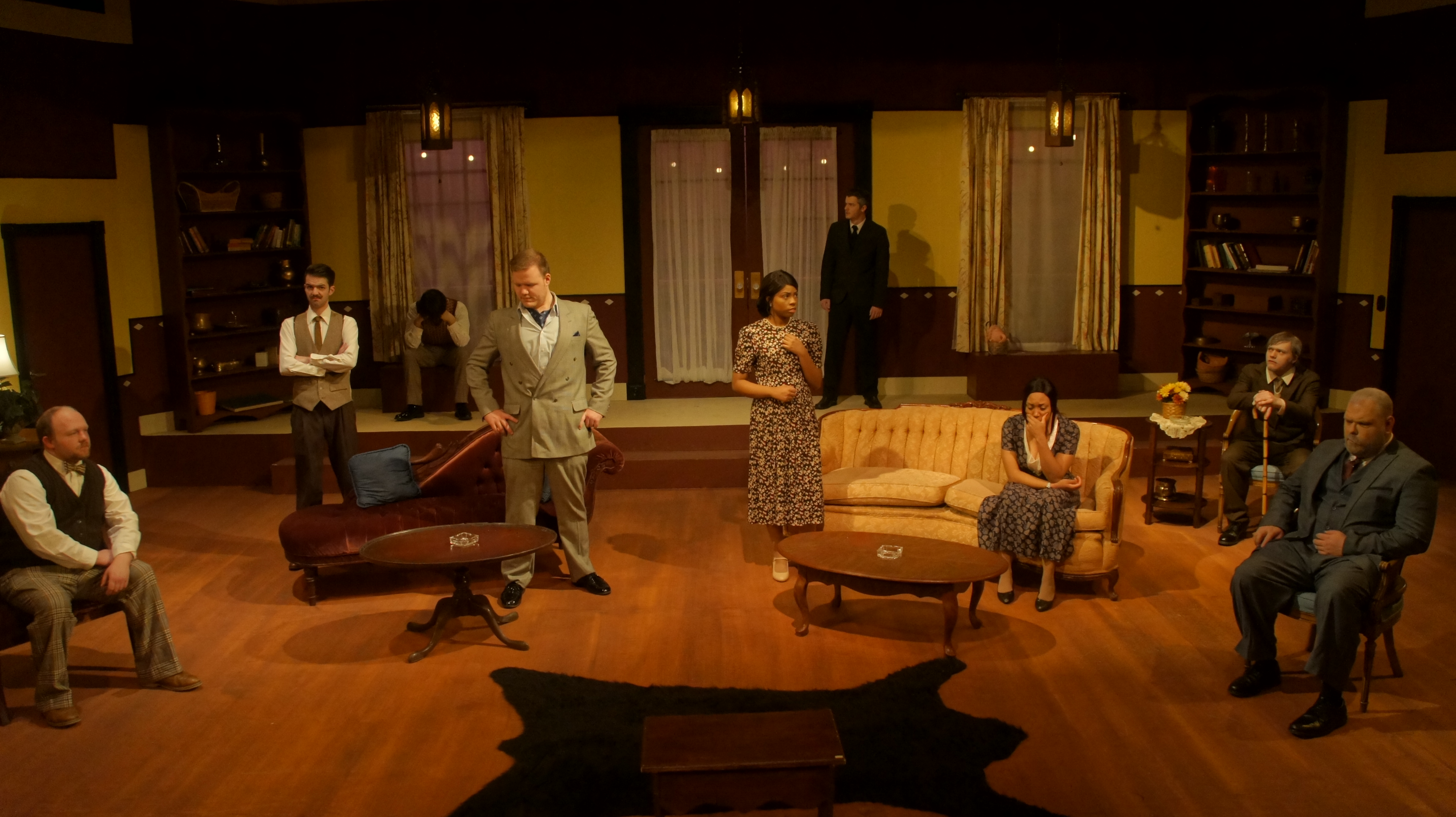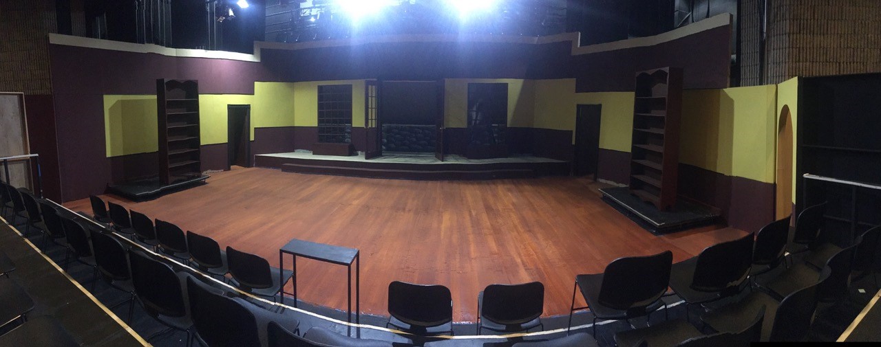I held the positions of Scenic Charge Artist & Props Designer for this production at Henry Ford College. Dark blood reds offest by jarring yellow, wood floors, sandstone dais and 34′ x 3′ stone half wall on the exterior. Bear skins (one rug and two additional on the walls, not pictured) were made for this show, and later reused at HFC and other local theatres. The Ten Little Soldiers poem was hand lettered on plexiglass and hung above the fireplace, which was positioned in the middle of the front row. The little soldier statues were simply made with childrens plastic figures attached to wood and painted with clear gloss. Thanks to this show I can now brag about my noose tying skills.