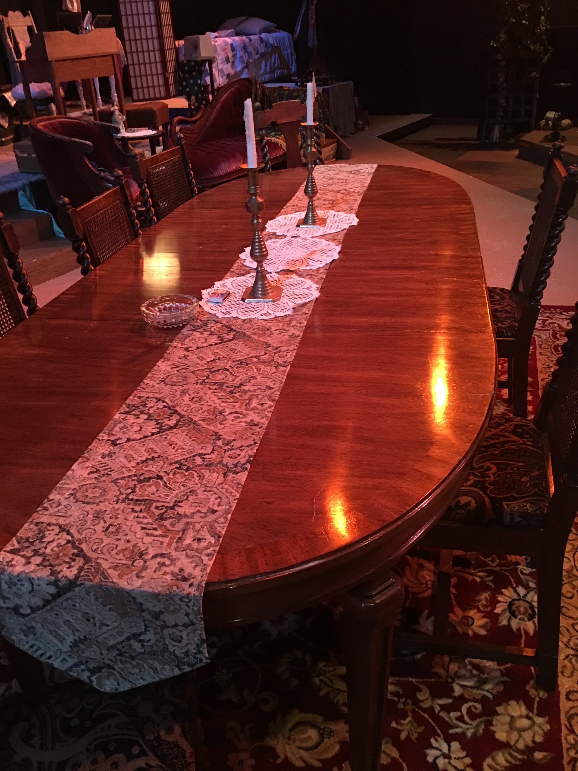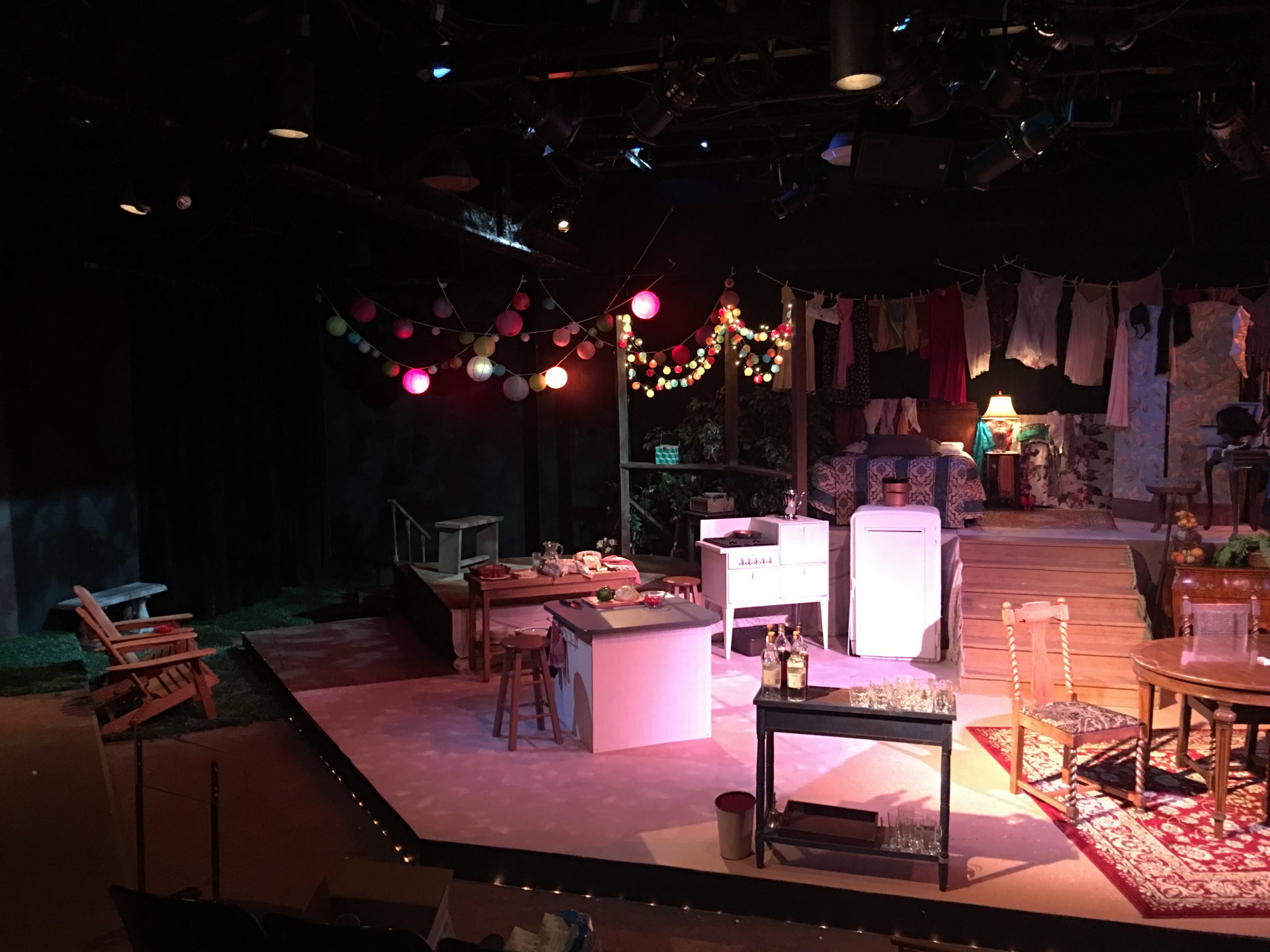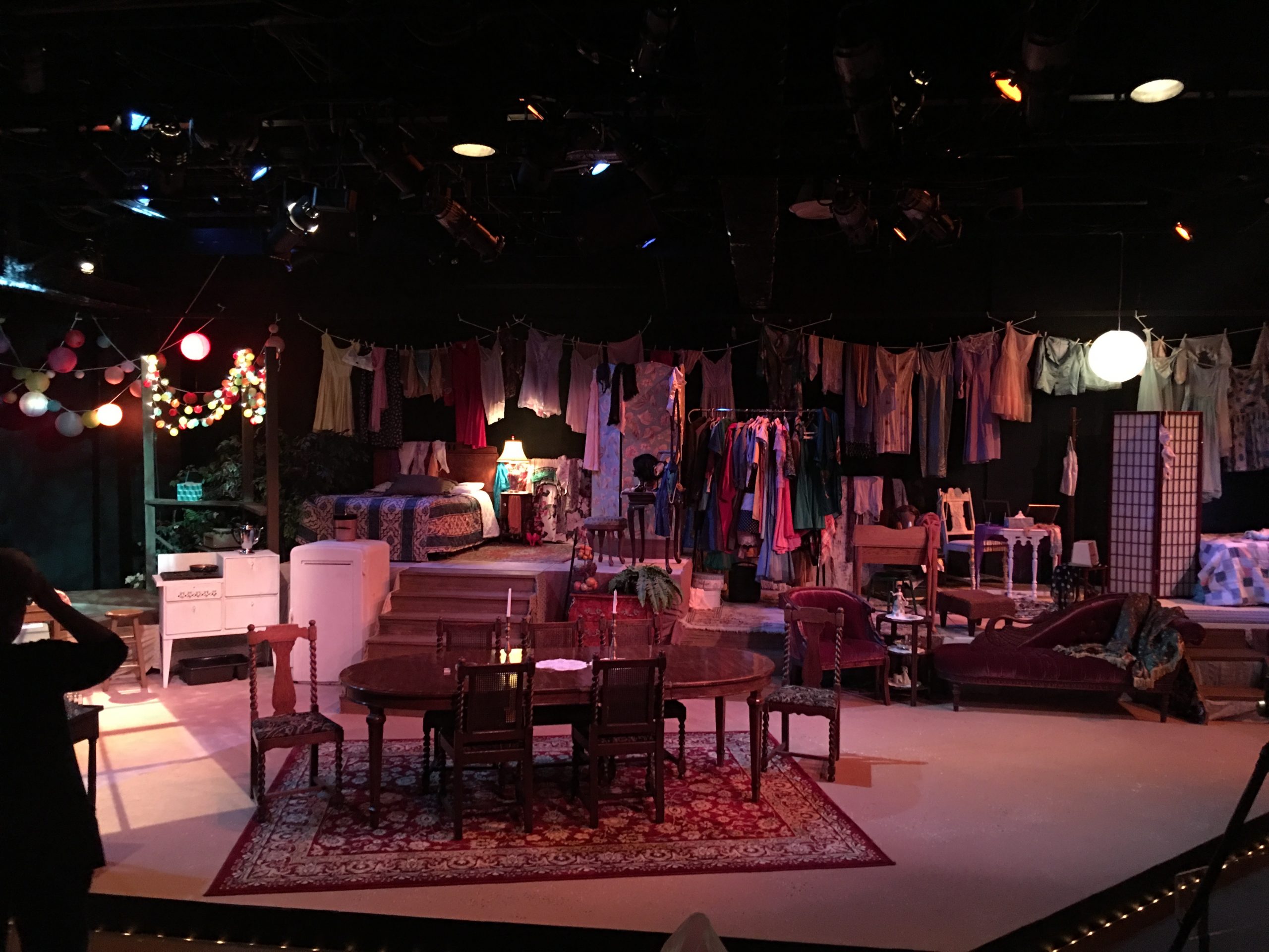 Stitching a table runner in the dark, finding just the right vintage makeup case, loads of liqour bottles and smoking paraphanlia, stocking up on cheesecakes left mostly uneaten, and lucking upon just the right record player for a collection of 45’s. Actors put makeup on during scenes, which meant finding mirrors that would not catch the stage light or block the actor while still actually being useful. I worked closely with the scenic designer to fill out the set with dresses, undergarments, scarves and jewelery hanging from every possible place. I became fascinated recreating the Transvestia magazine and probably spent too much time getting the cover just right for it’s brief stage appearance. I only wish I had more photos…