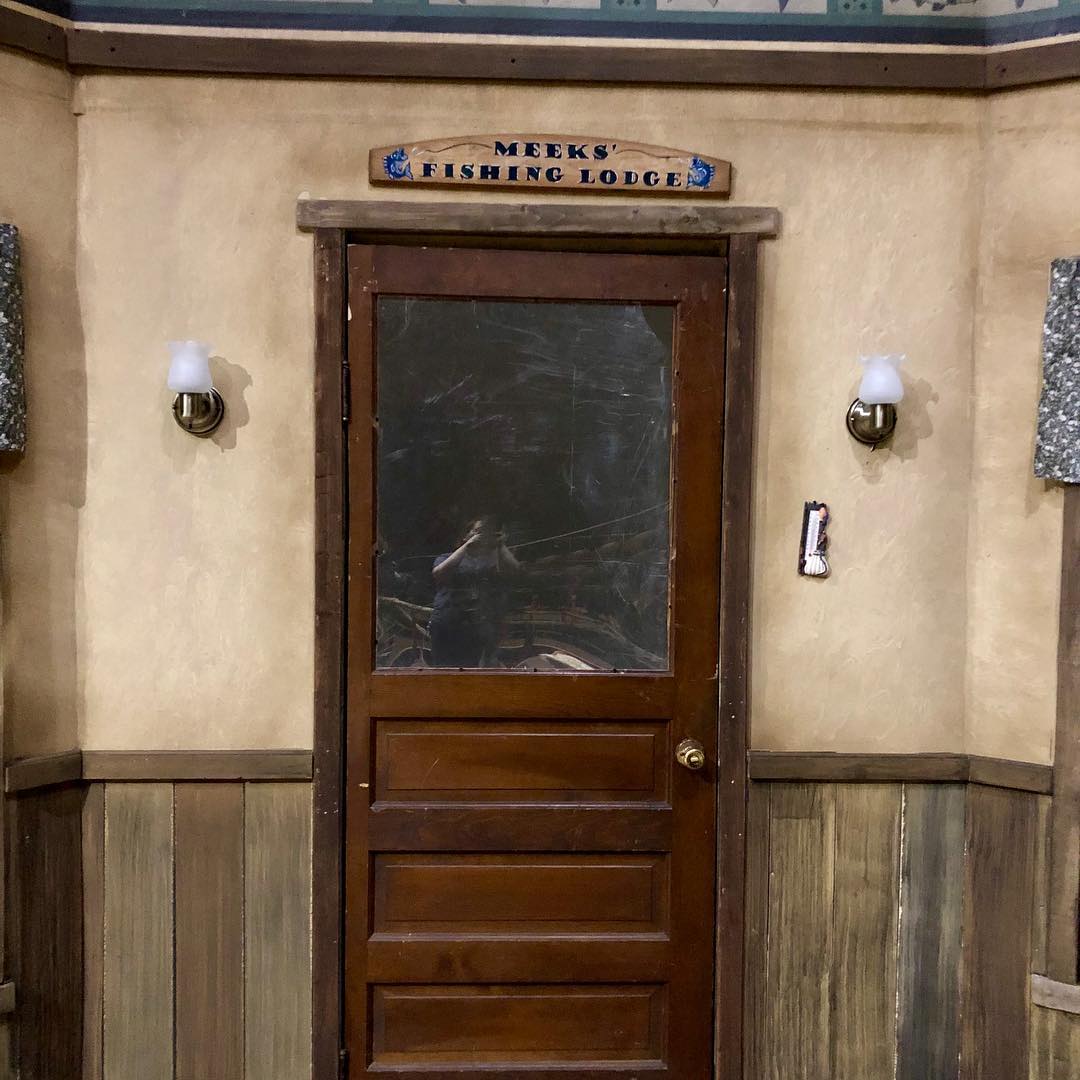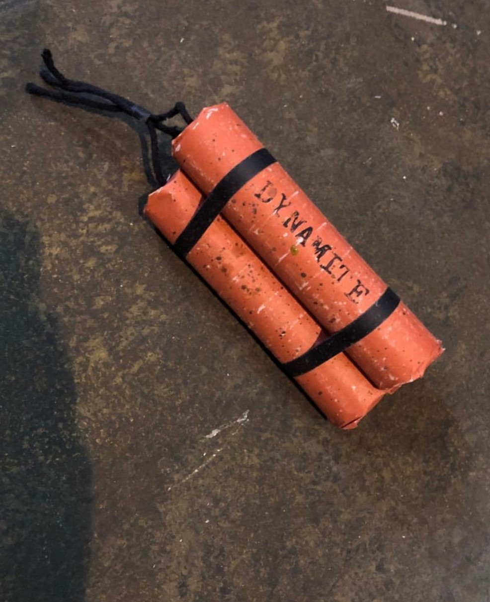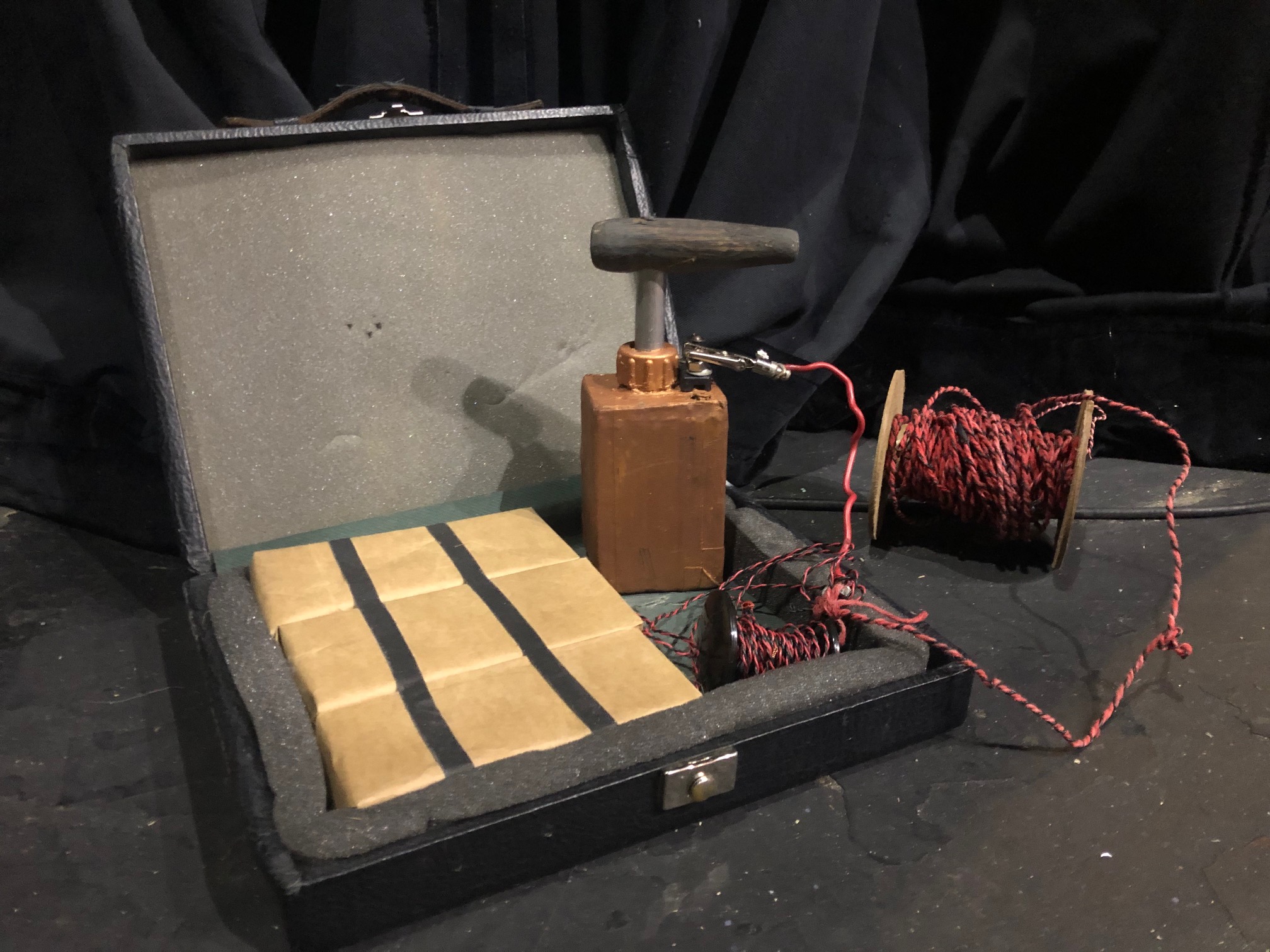 The Meeks Lodge sign was a thrift store find that I stripped down and repainted.  The portable bomb was made entirely out of random scraps found under my props table and mounted it in a small valet case. I dyed cotton twine red and twisted it with found black wire to make a long spool to connect to the plunger.