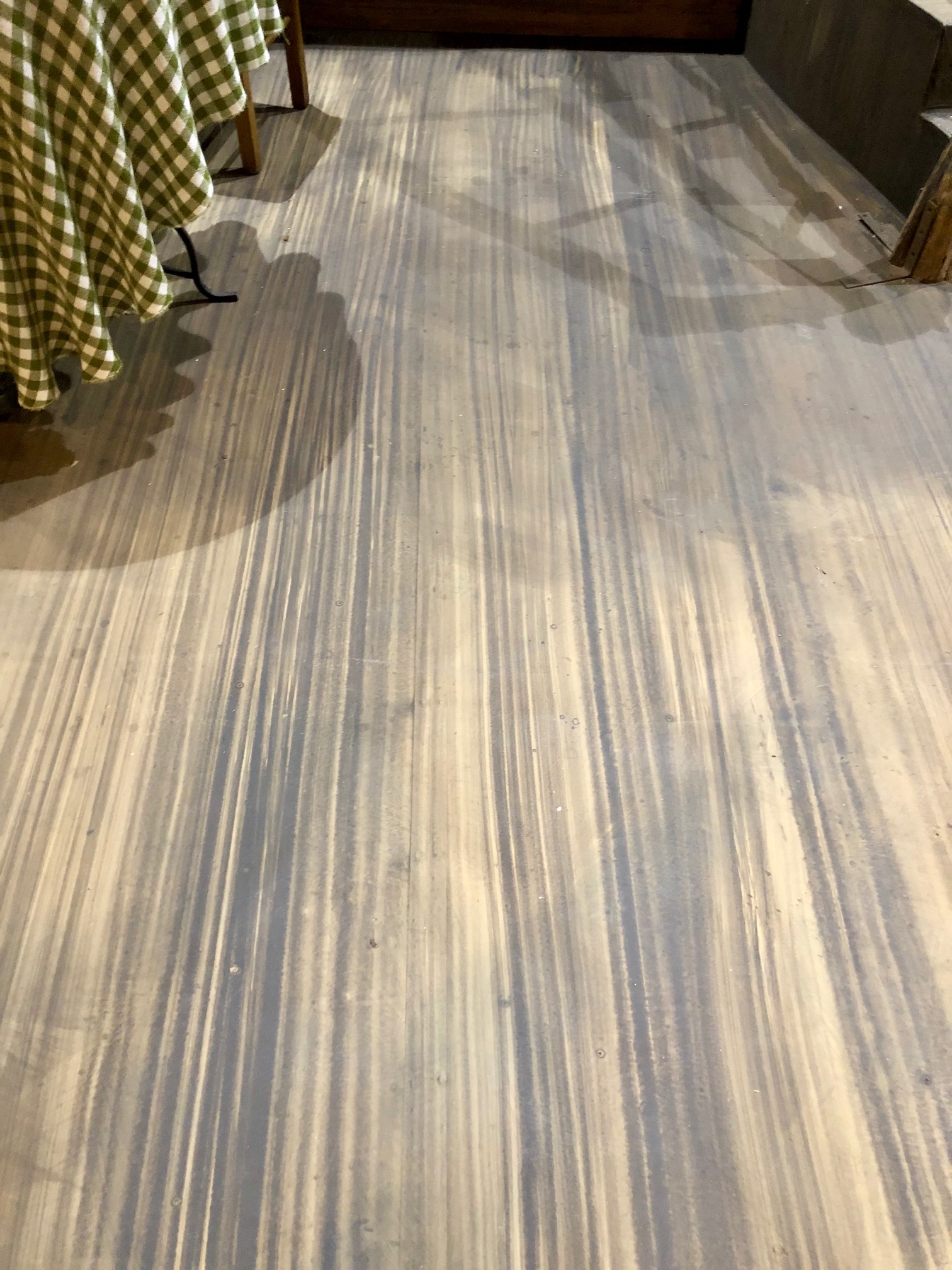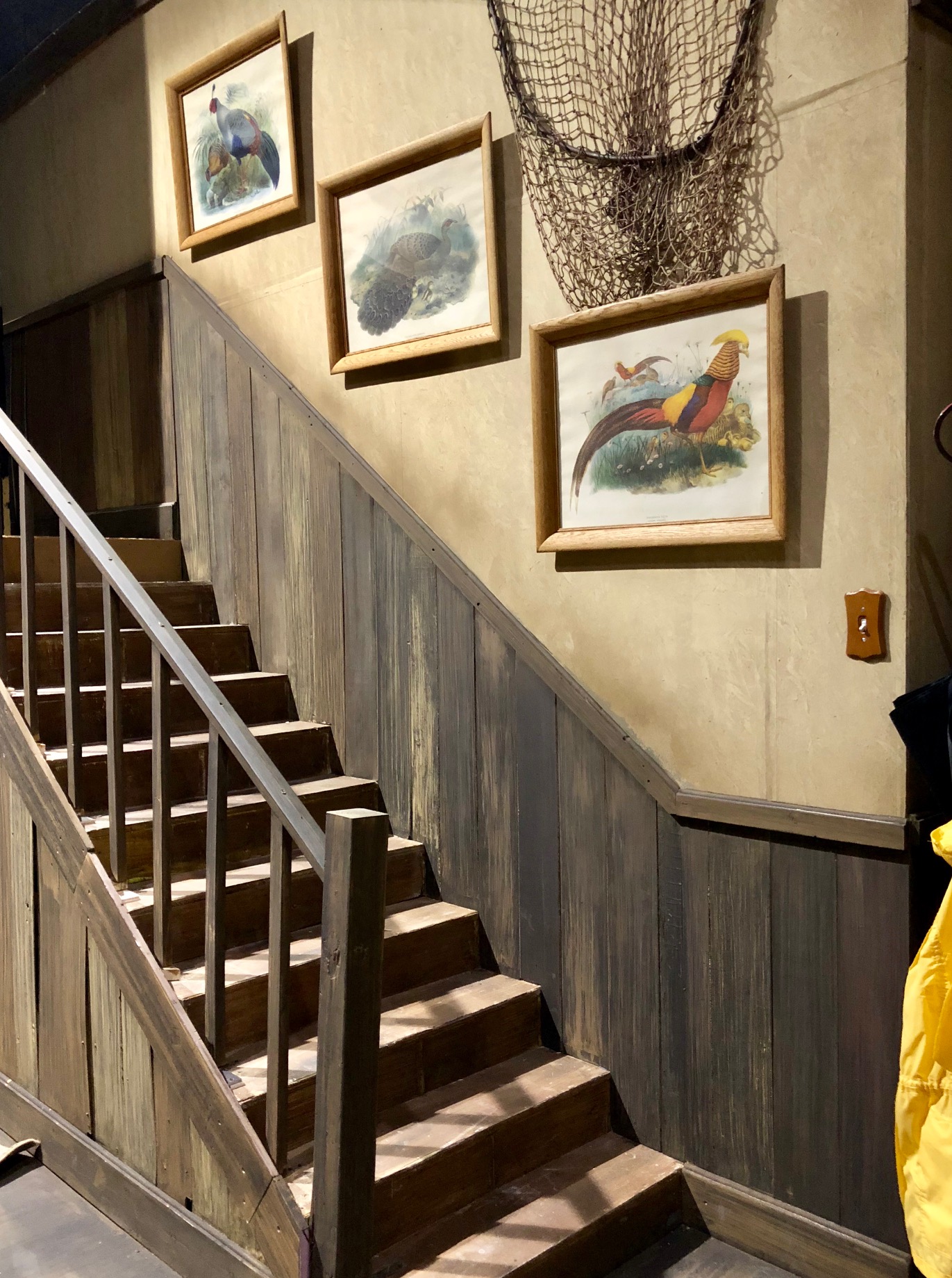Easily one of my favorite sets to paint! Lots of wood graining, rag rolling, sponging, and staining. Our carpenter cut strips of scrap luan and masonite to create the wainscotting, so I played with different wood grain palettes to maintain that variety.  The wallpaper border was printed by the graphics department and pasted to the wall with watered down mod podge.  Large carpet tubes were cut in half, textured and painted for chink logs on the exterior down stage.