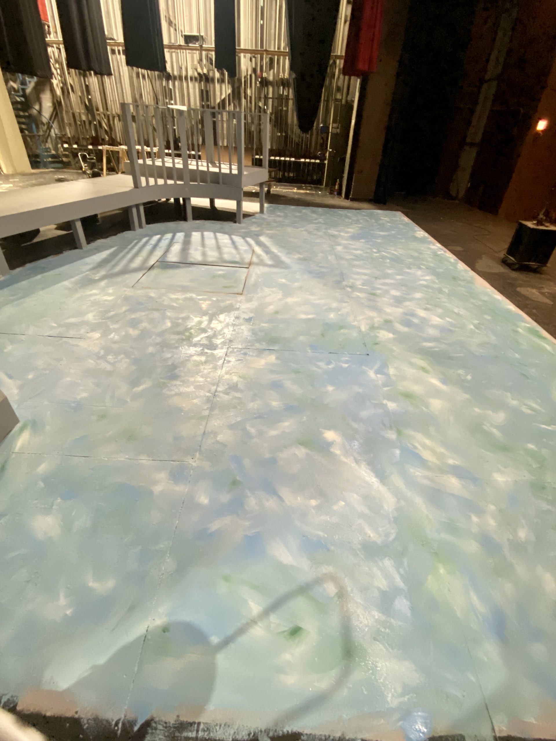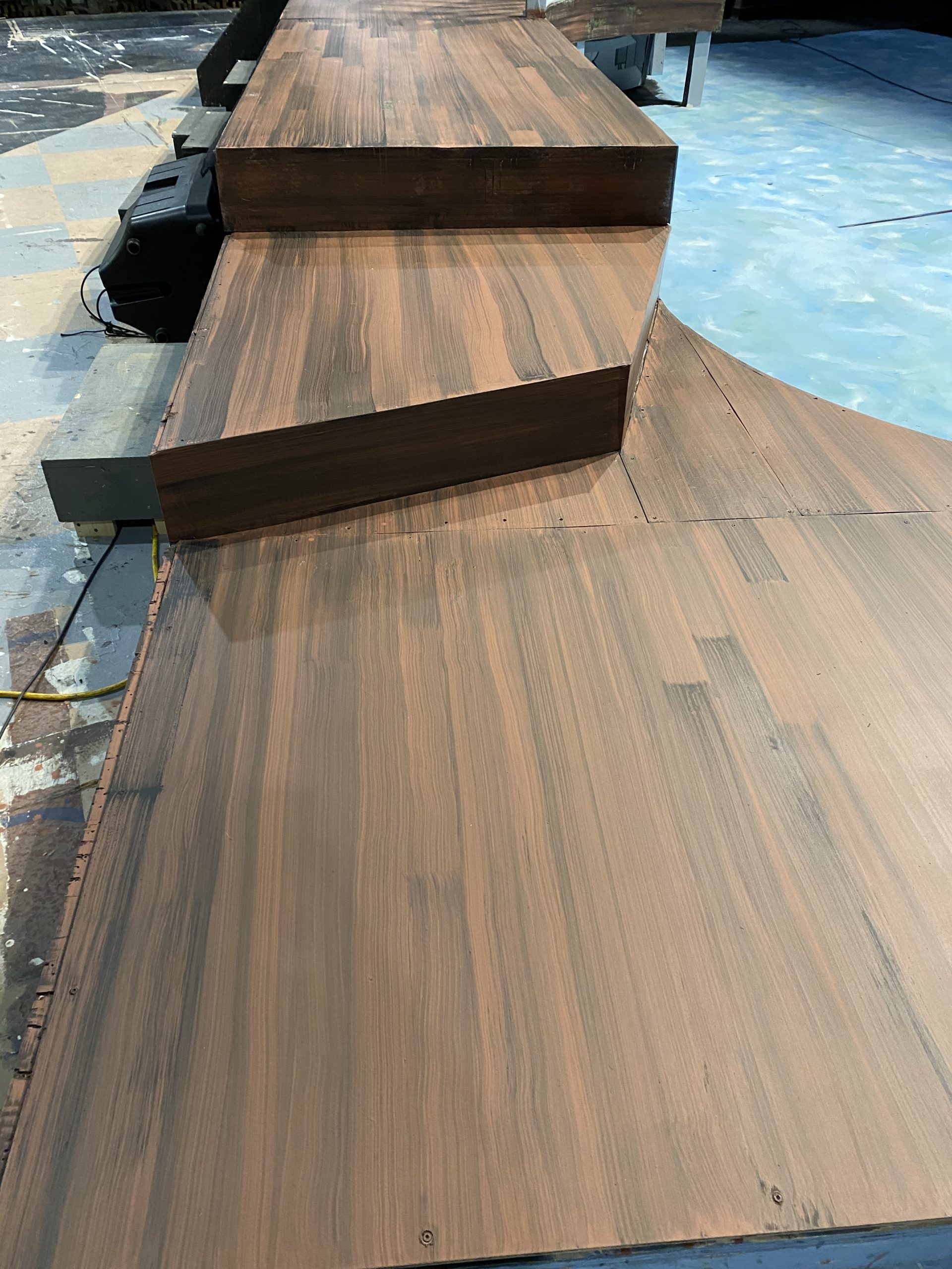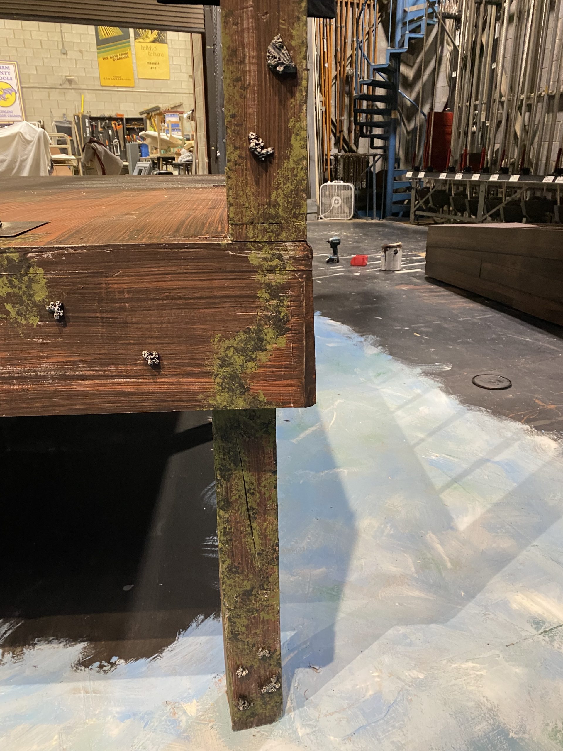 Under the Technical Director, I collaborated with scenic technicians and supervised construction students to create scenic elements including: installation , prepping and painting of platforms; building & installing of facing and railing; painting the stage floor; installing platform underneath the trap; painting the boat.