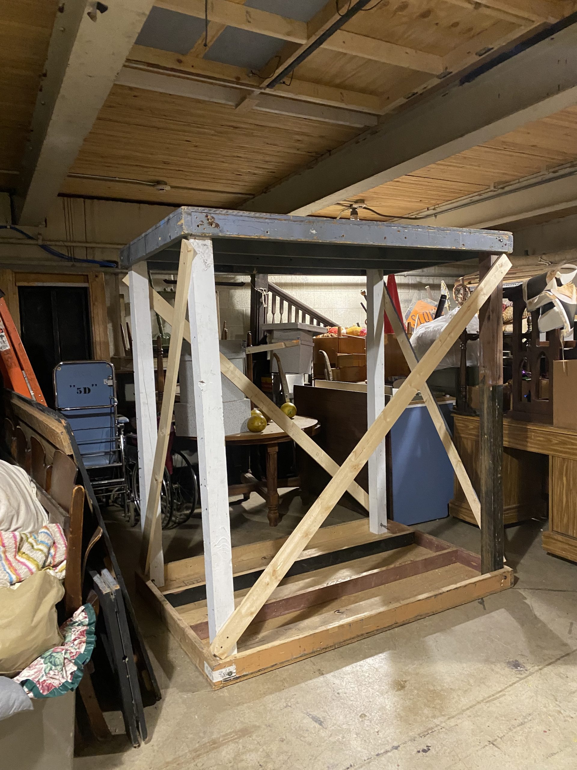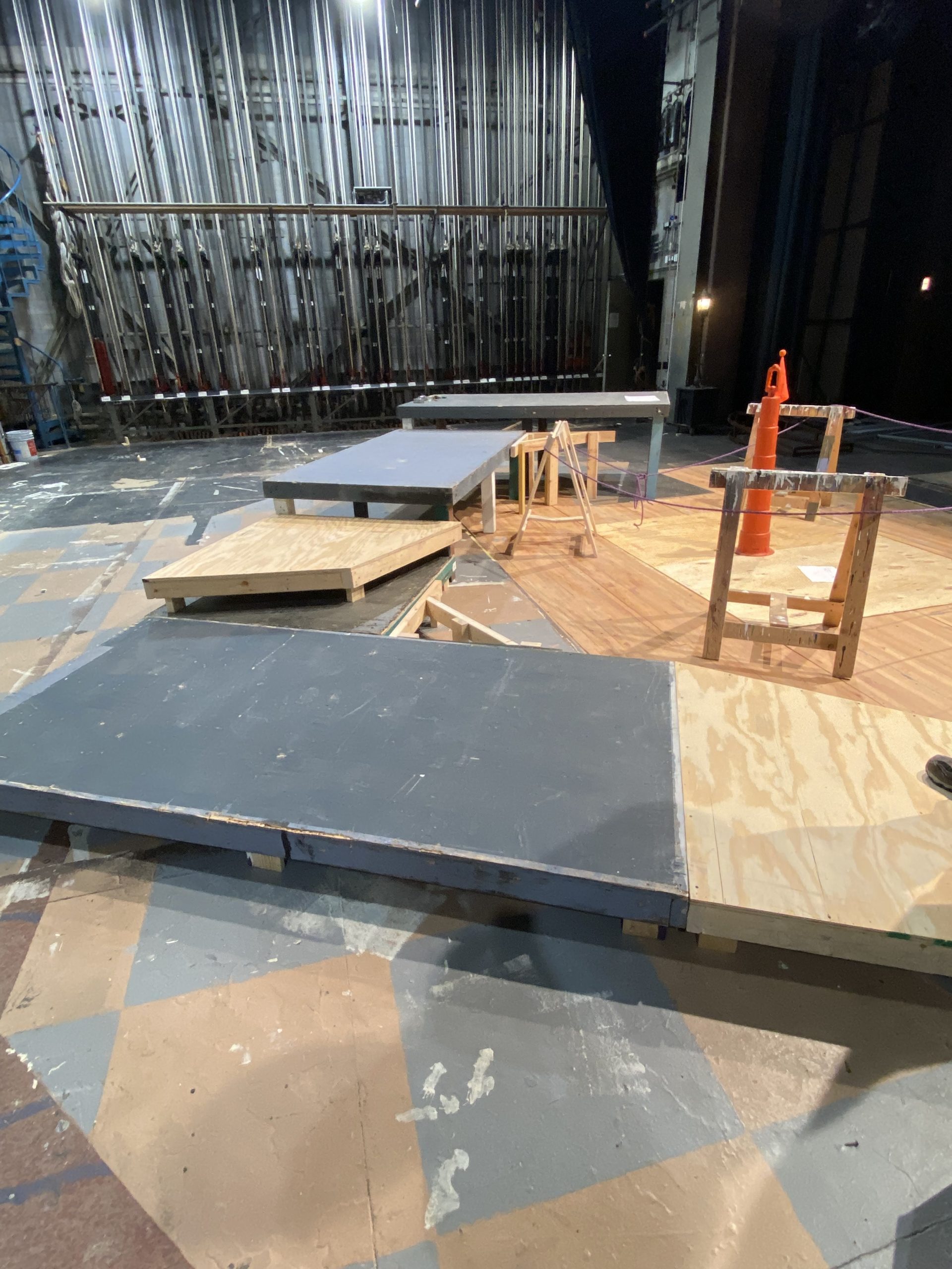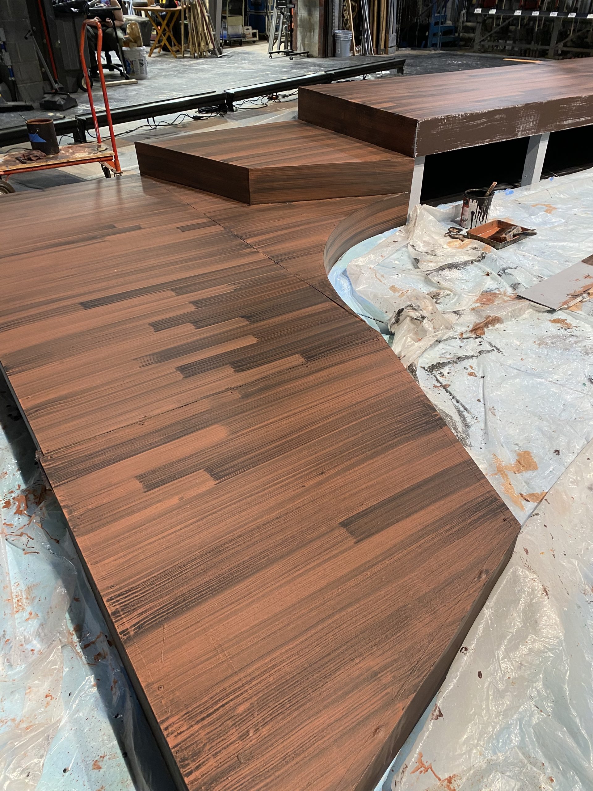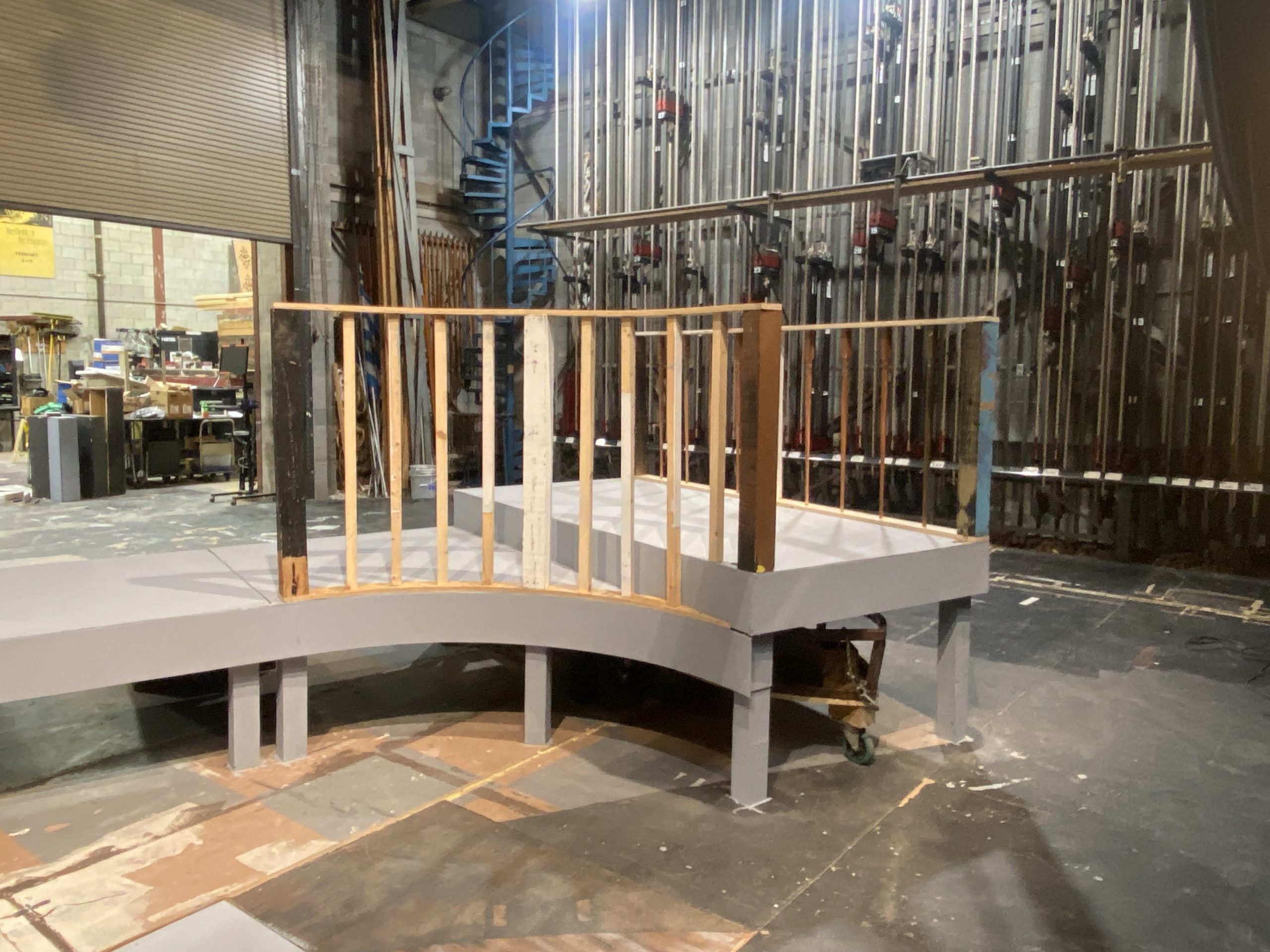 Under the Technical Director, I collaborated with scenic technicians and supervised construction students to create scenic elements including: installation , prepping and painting of platforms; building & installing of facing and railing; painting the stage floor; installing platform underneath the trap; painting the boat.