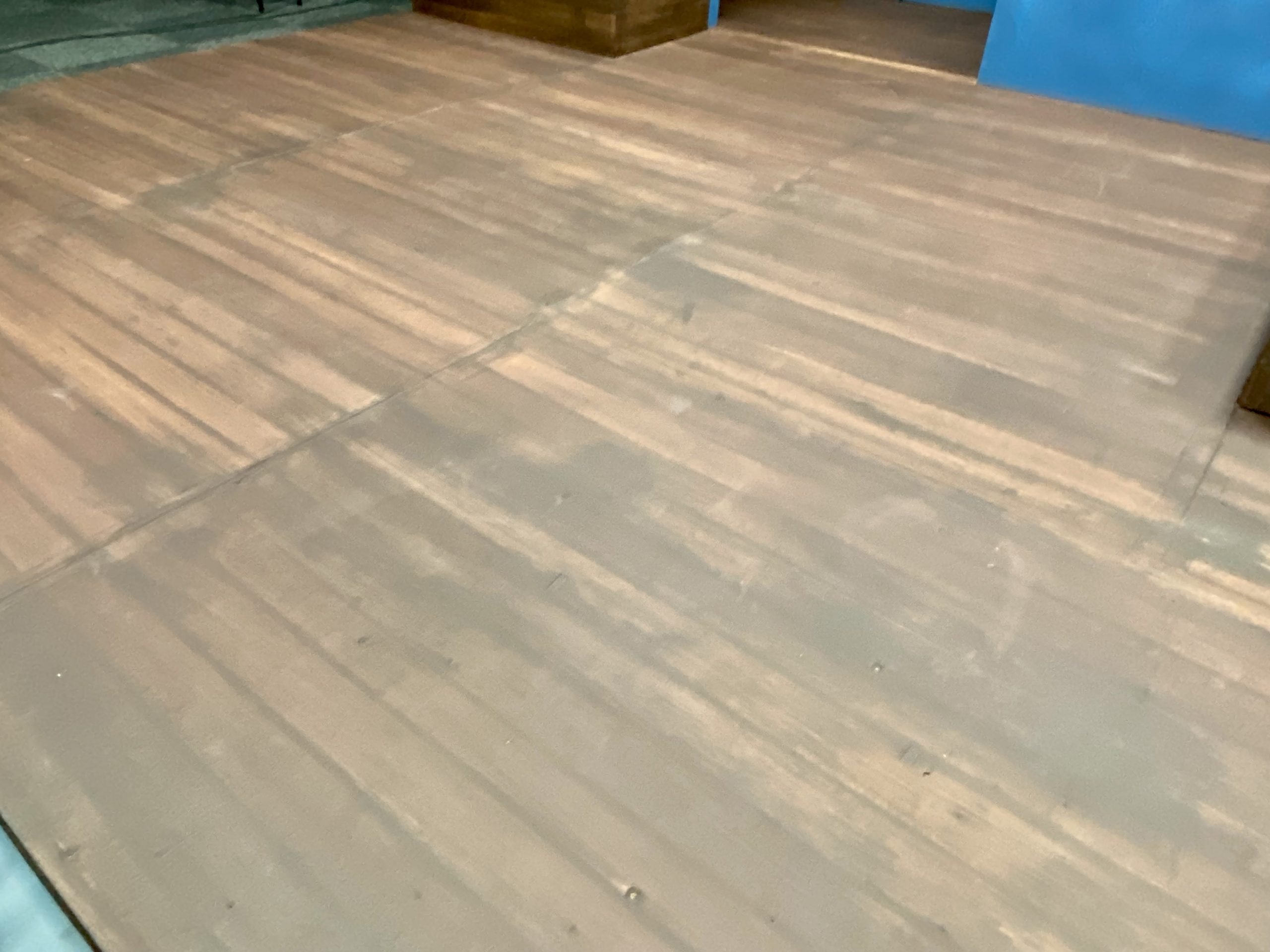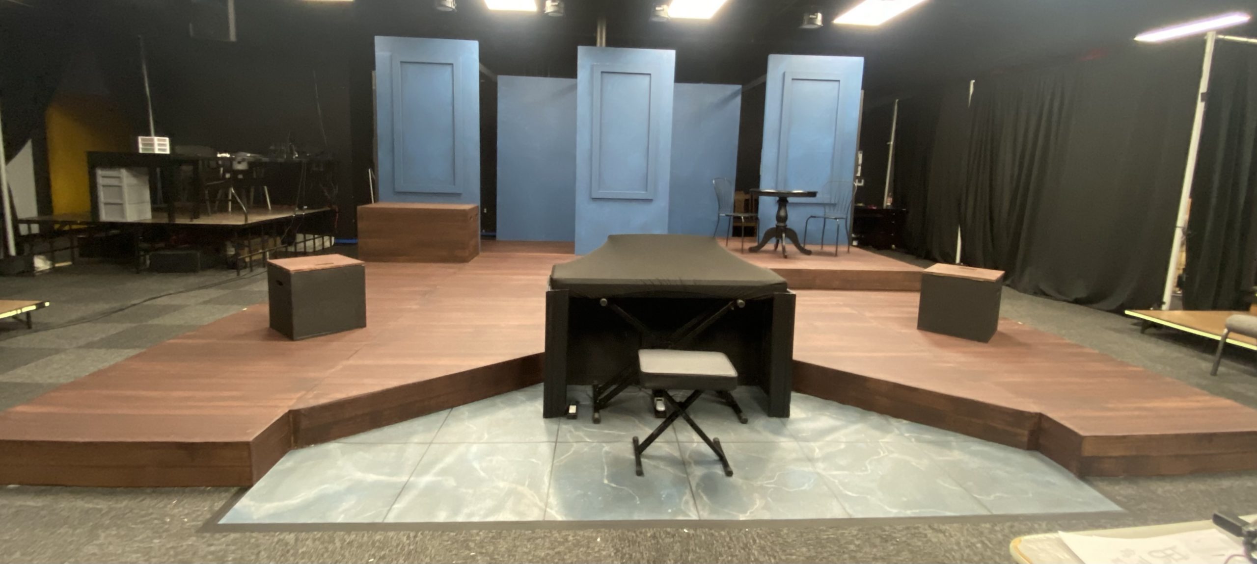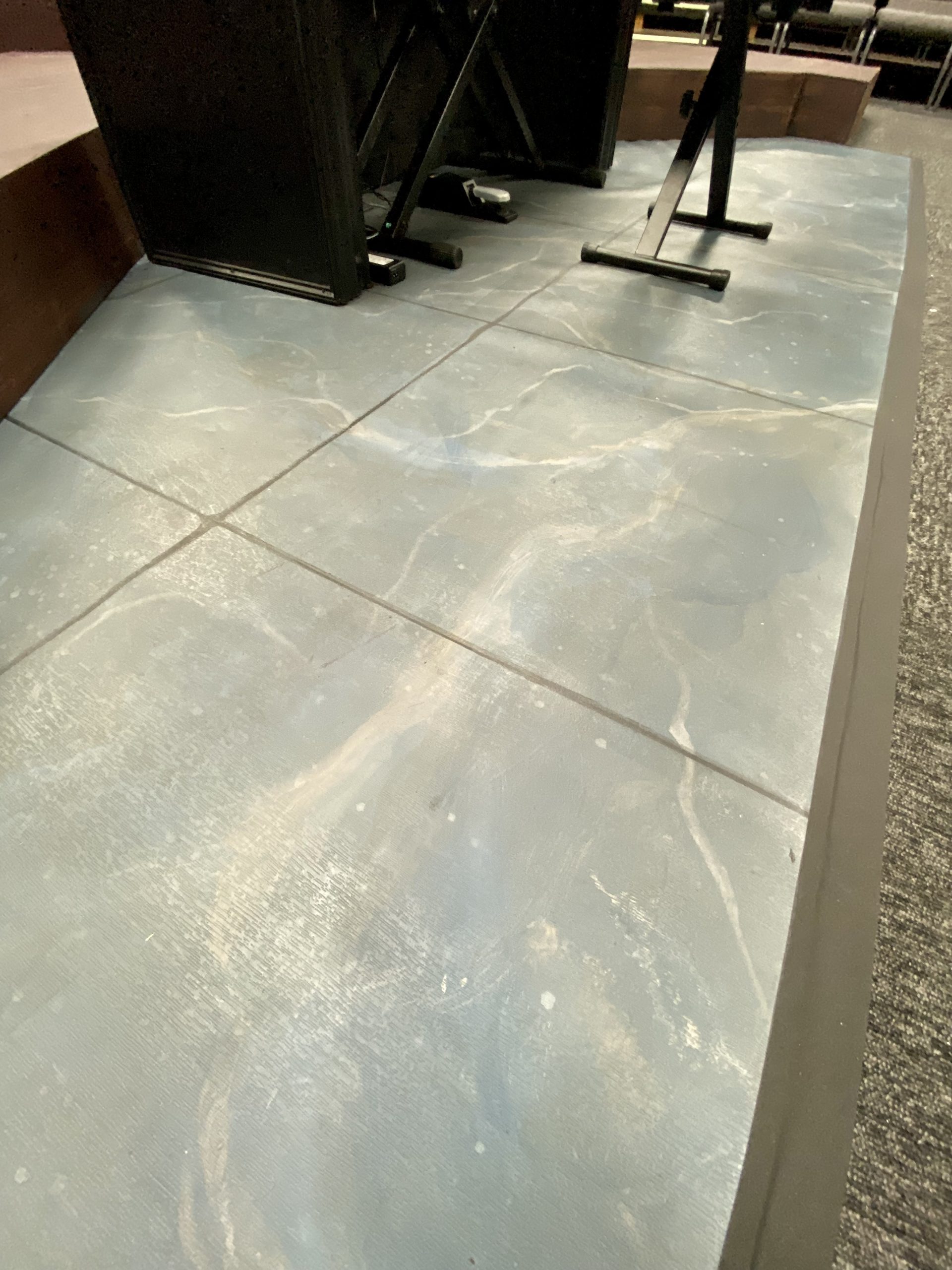 I shifted platforms to create levels, and painted a piece of sheet vinyl to include the piano in the space. I also built a simple shell to mask the keyboard stand and cords.