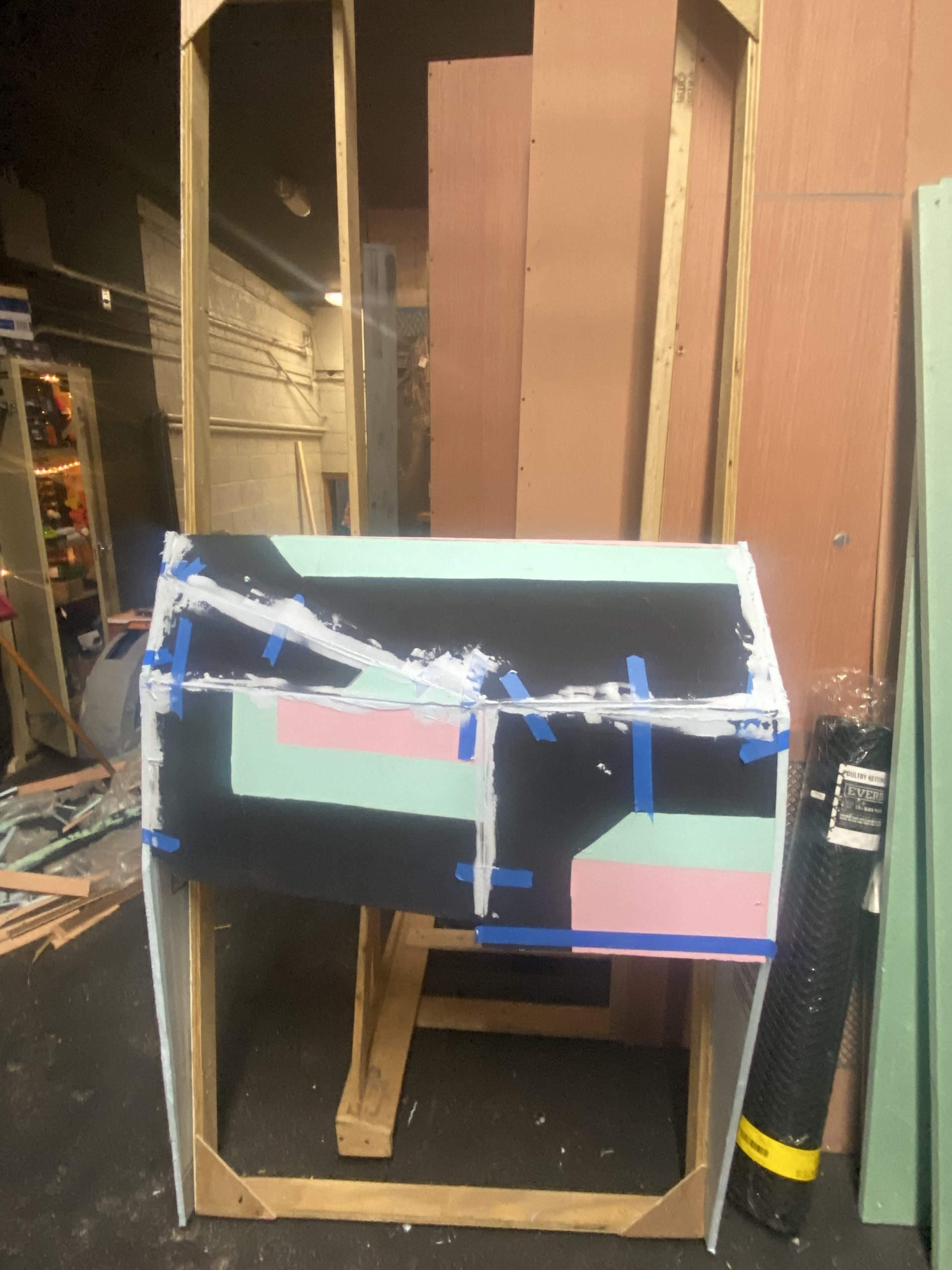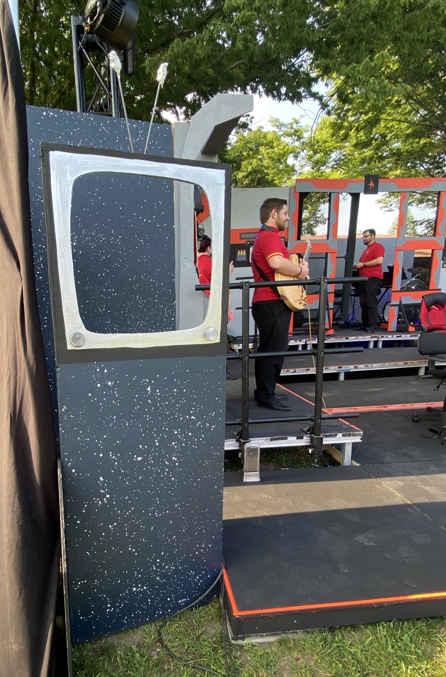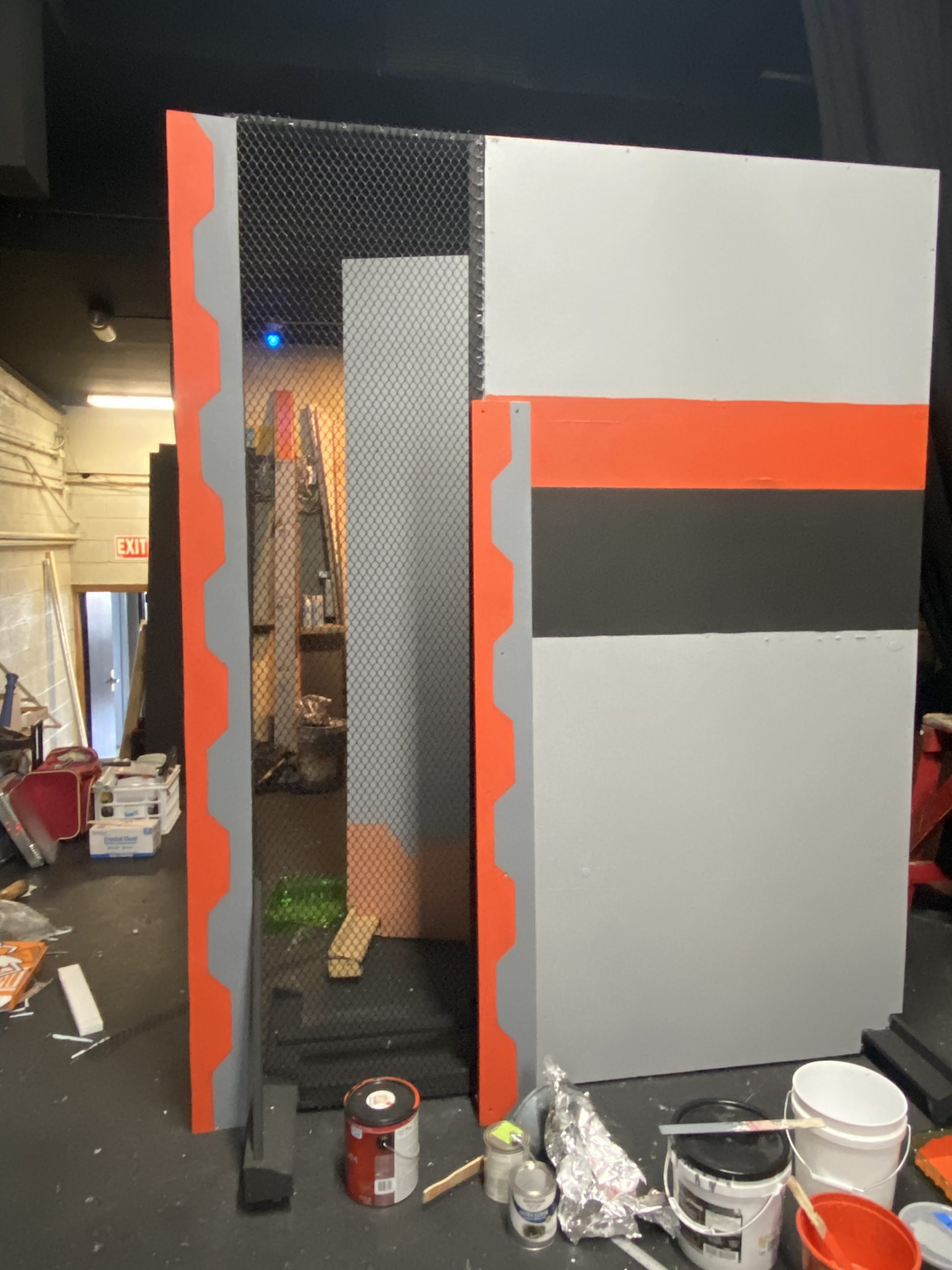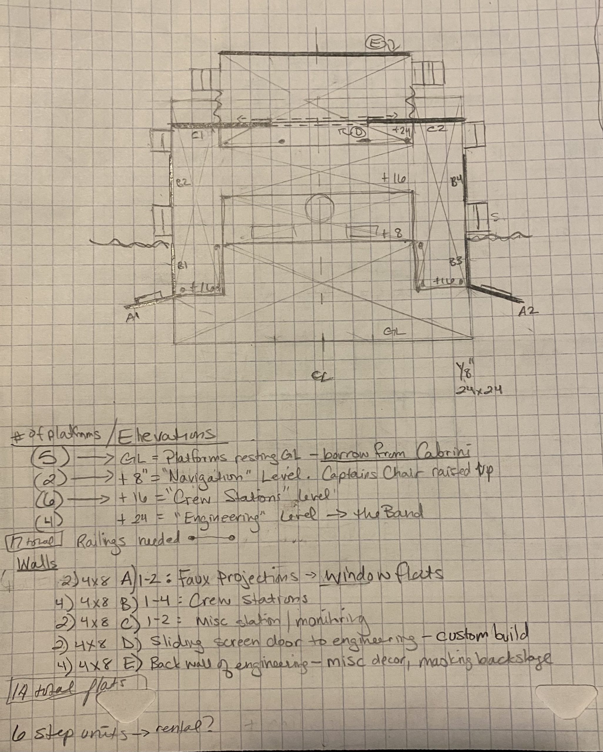 My first full scenic design, made with mostly recycled and repurposed materials and borrowed flats. The director and I wanted to include classic TV sci-fi elements to make this nostalgic for everyone. The view screen stage left functioned as a puppet theatre, while the TV screen stage right was for the news announcer. I loved the “whoosh” door, which functioned as an USC entrance as well as semi-masking for the band, but my lack of expertise and the excessive rain, made it a challenging scenic element. The director and cast embraced the concept though, and it became a running gag throughout performances that everyone using it said “whoosh”, in character, to make it open & close. All drafting and rendering was by hand.