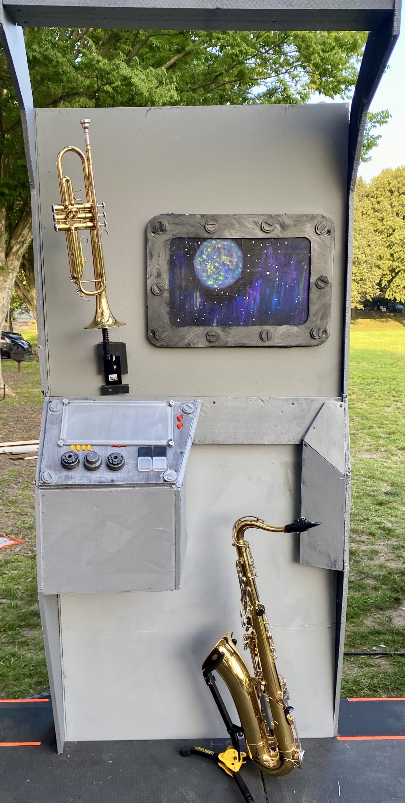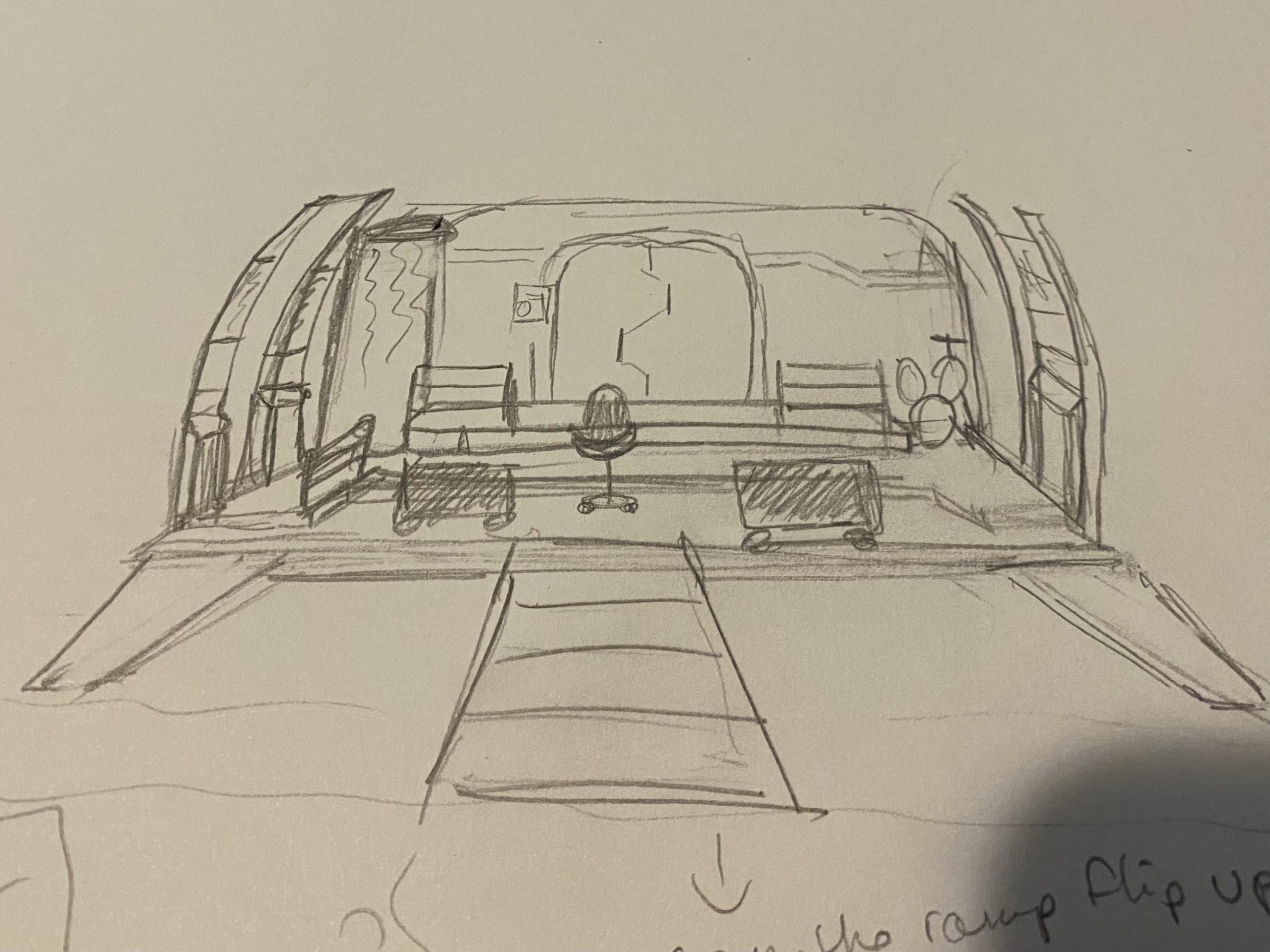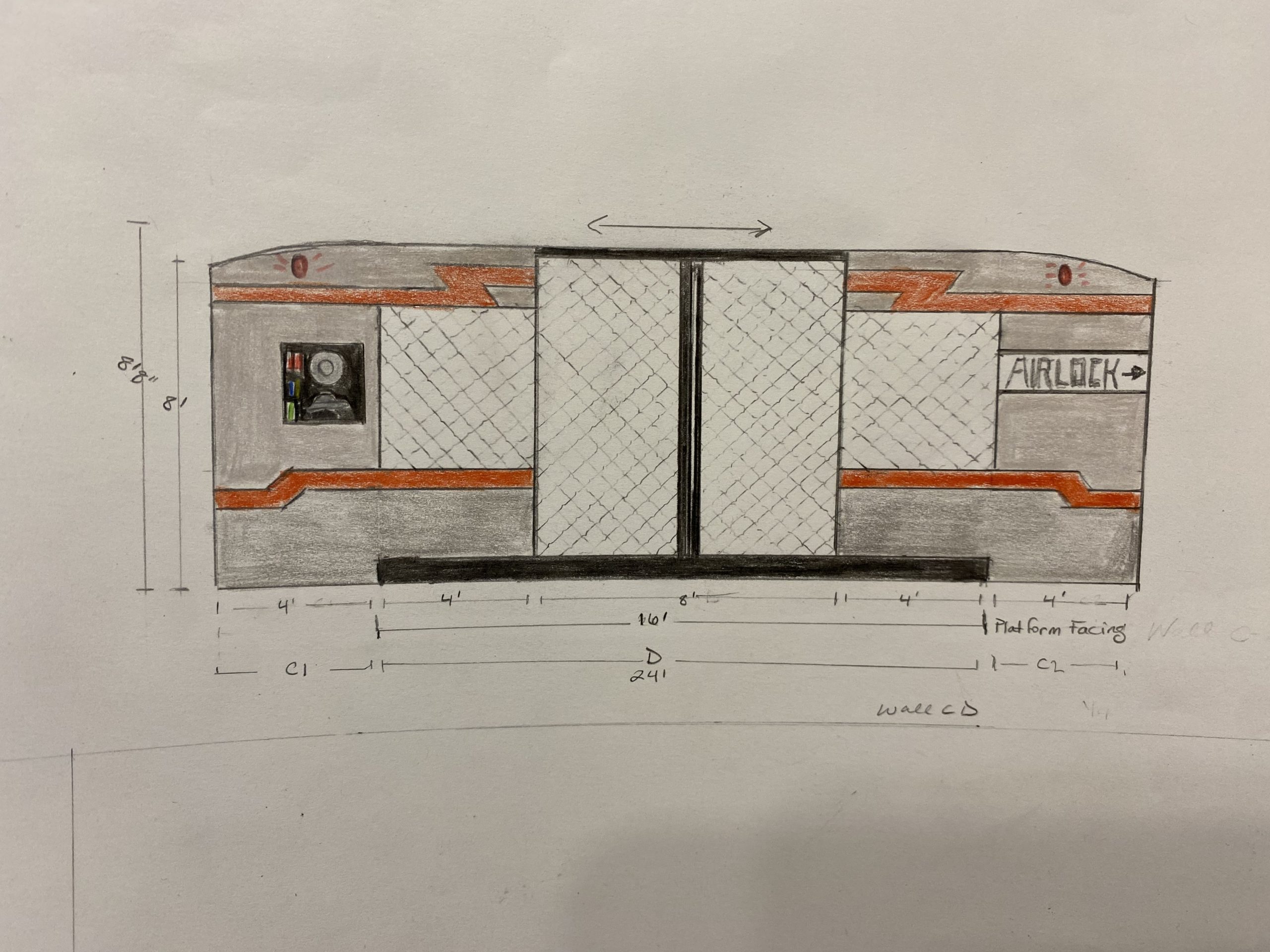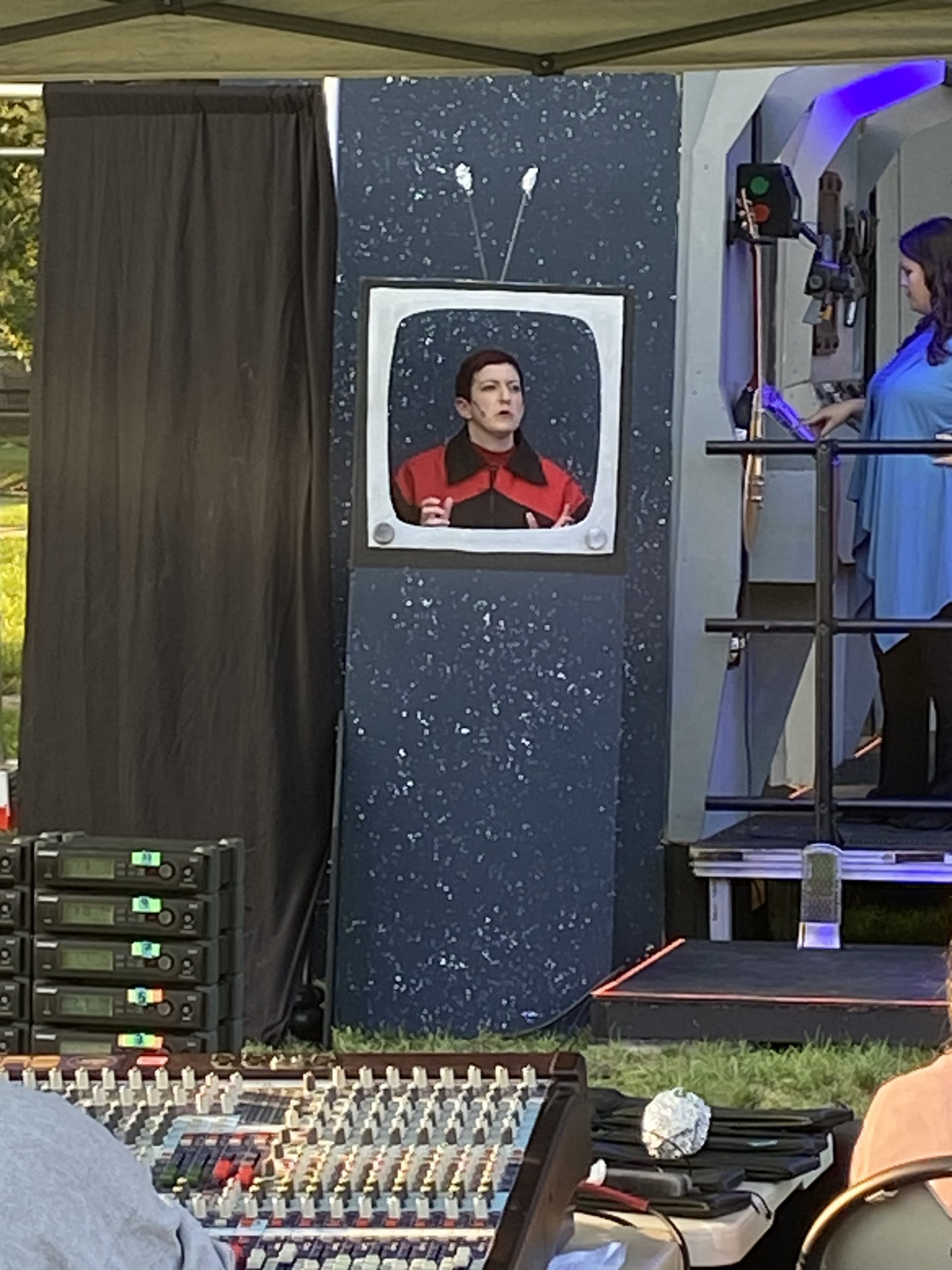My first full scenic design, made with mostly recycled and repurposed materials and borrowed flats. The director and I wanted to include classic TV sci-fi elements to make this nostalgic for everyone. The view screen stage left functioned as a puppet theatre, while the TV screen stage right was for the news announcer. I loved the “whoosh” door, which functioned as an USC entrance as well as semi-masking for the band, but my lack of expertise and the excessive rain, made it a challenging scenic element. The director and cast embraced the concept though, and it became a running gag throughout performances that everyone using it said “whoosh”, in character, to make it open & close. All drafting and rendering was by hand.