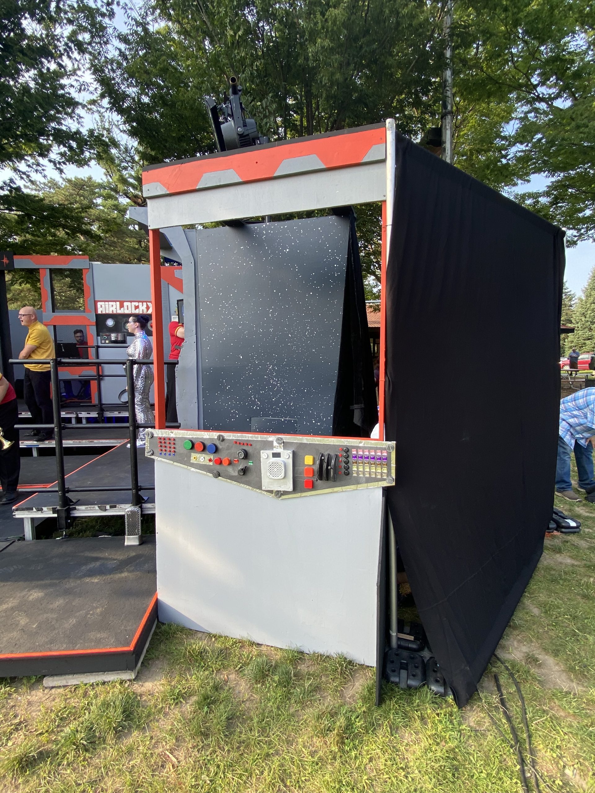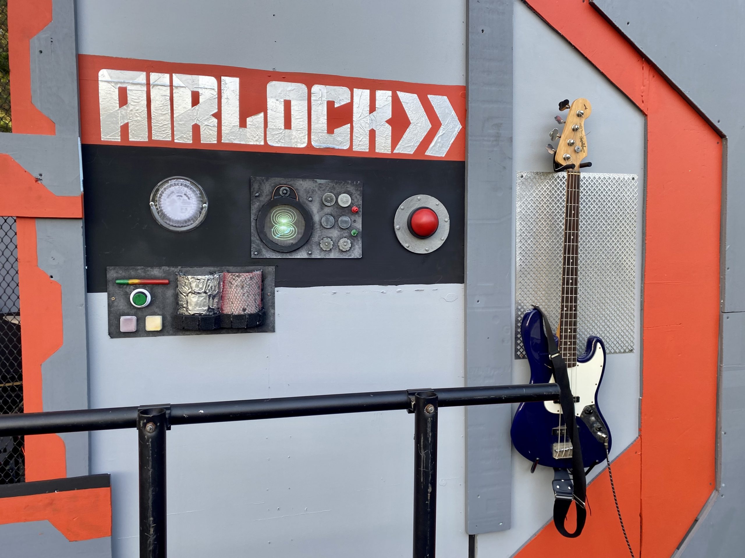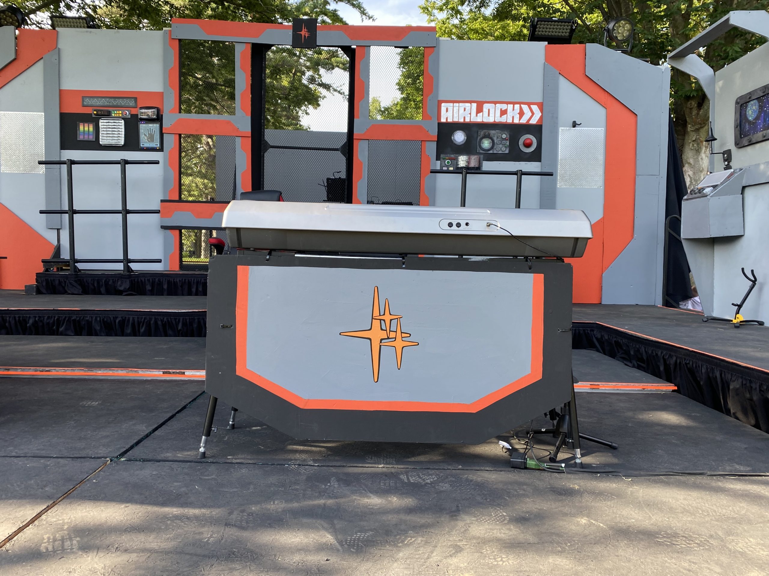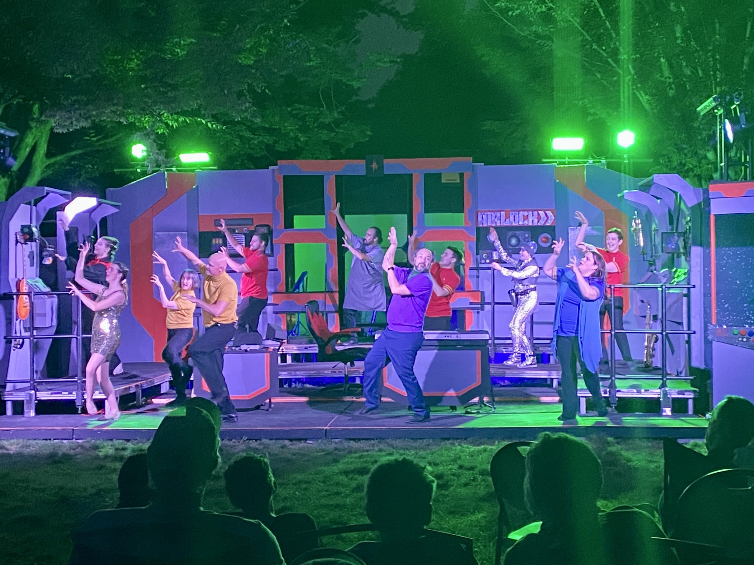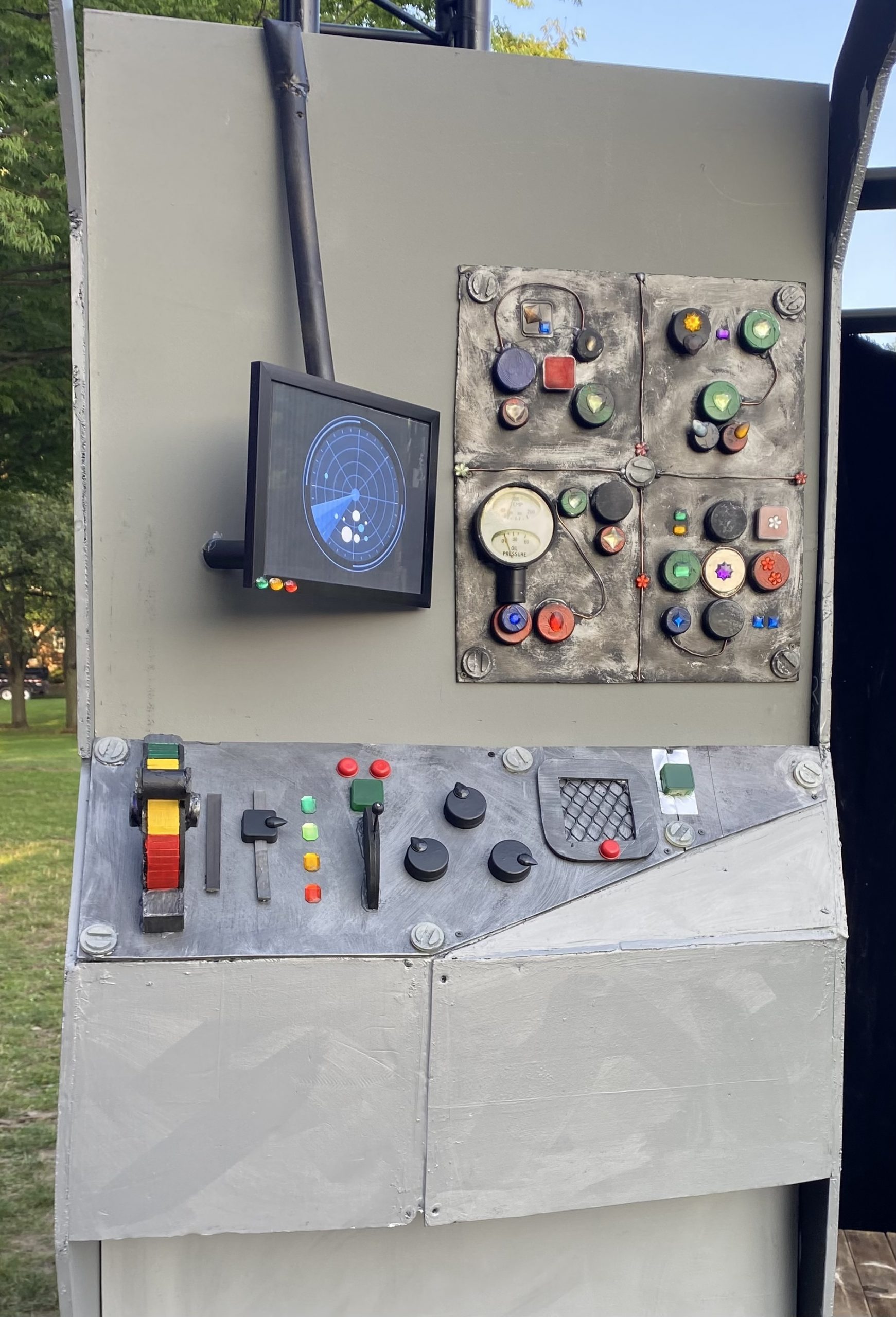 My first full scenic design, made with mostly recycled and repurposed materials and borrowed flats. The director and I wanted to include classic TV sci-fi elements to make this nostalgic for everyone. The view screen stage left functioned as a puppet theatre, while the TV screen stage right was for the news announcer. I loved the “whoosh” door, which functioned as an USC entrance as well as semi-masking for the band, but my lack of expertise and the excessive rain, made it a challenging scenic element. The director and cast embraced the concept though, and it became a running gag throughout performances that everyone using it said “whoosh”, in character, to make it open & close. All drafting and rendering was by hand.