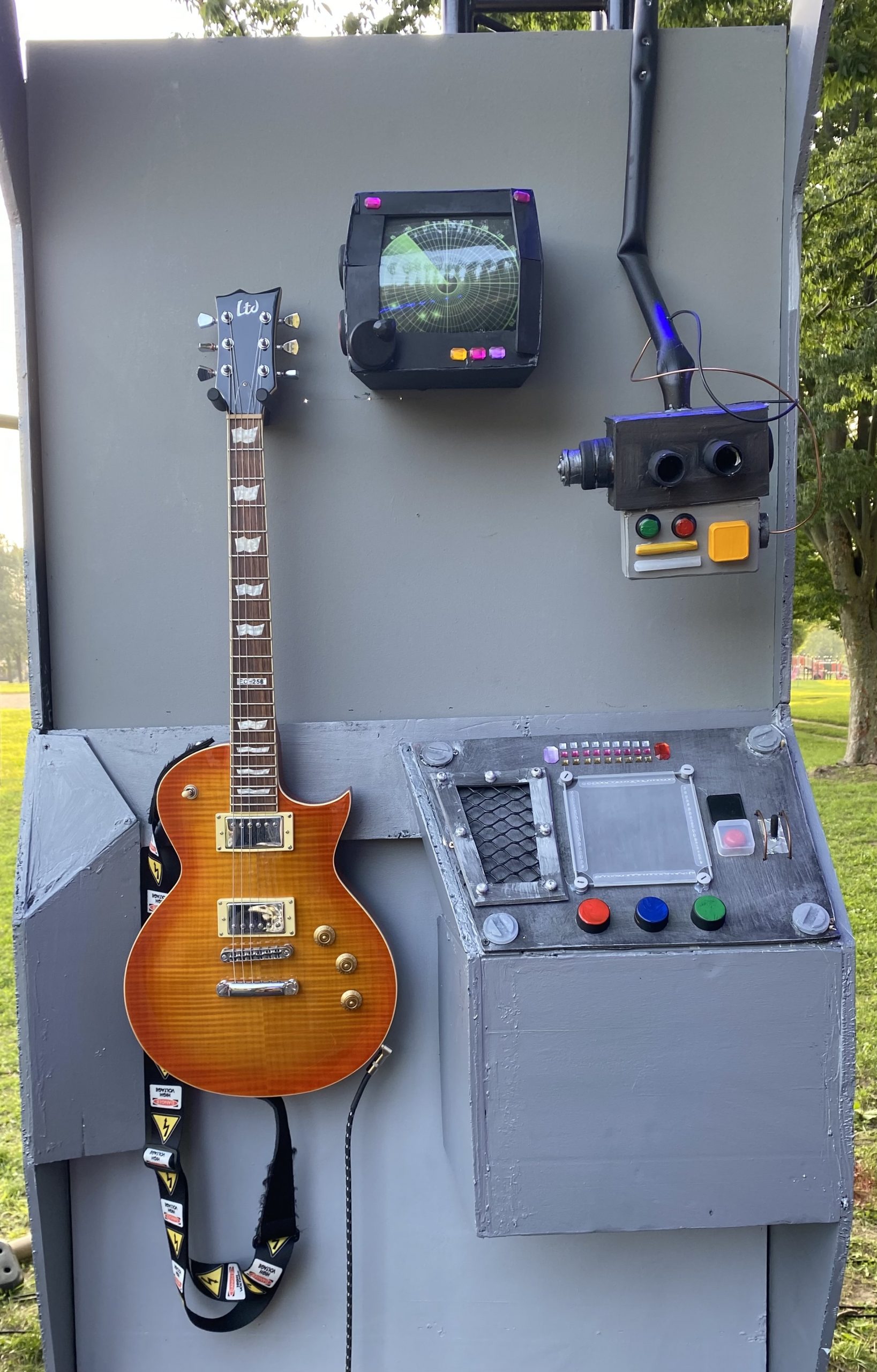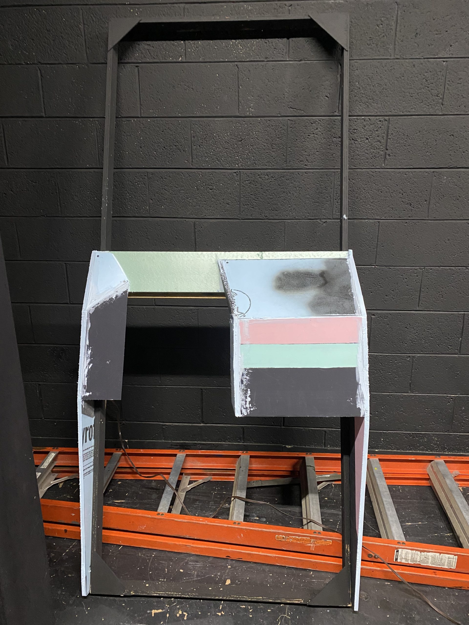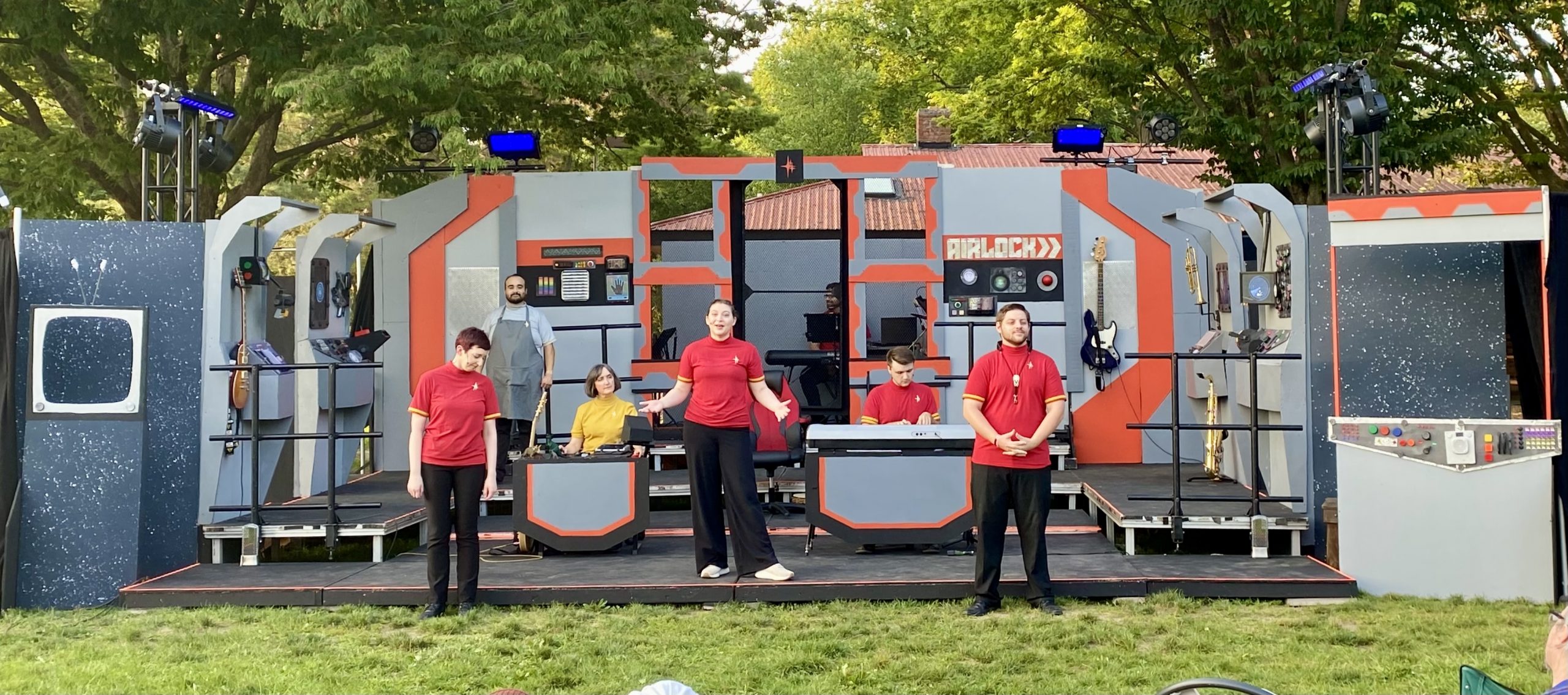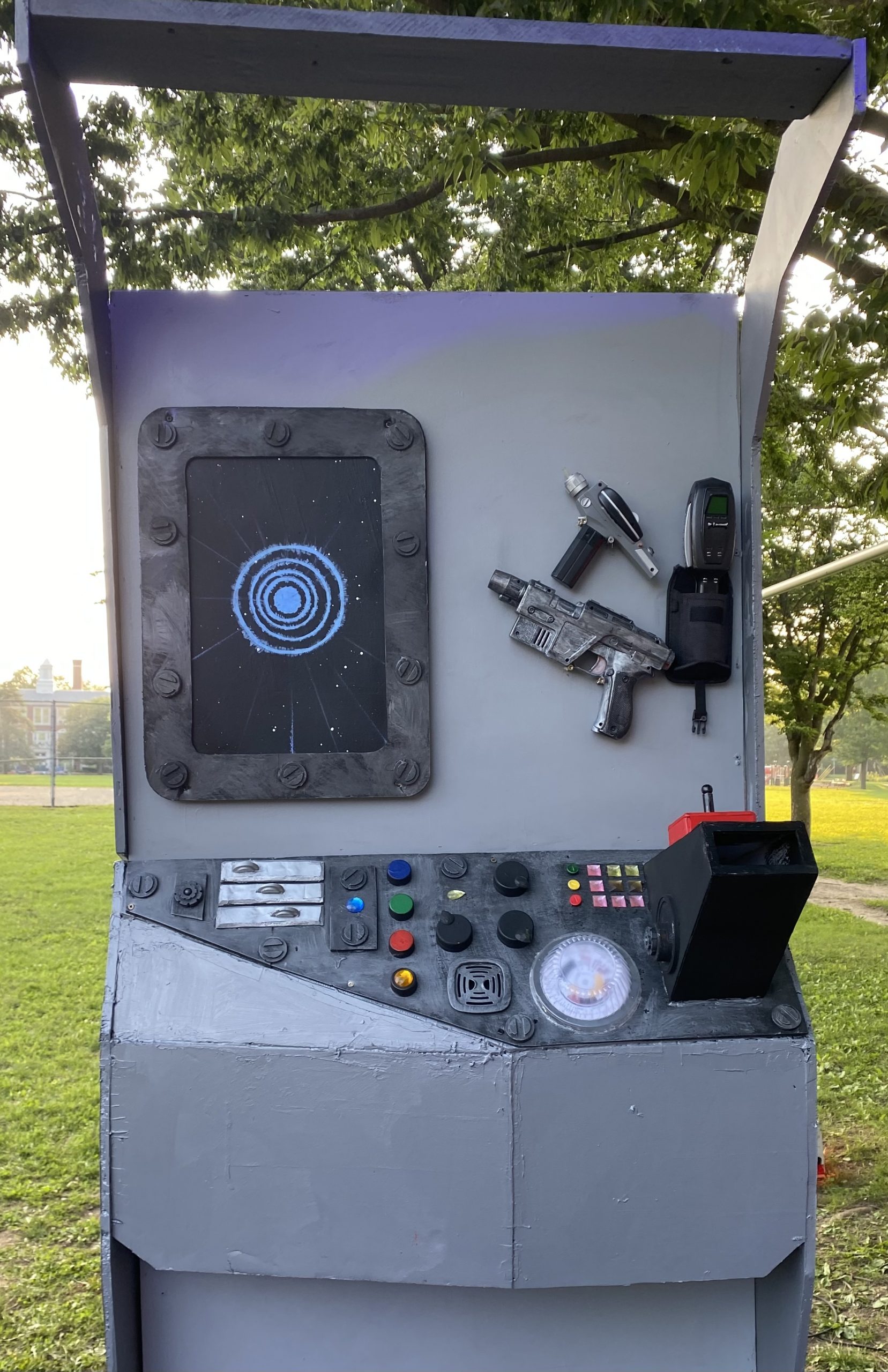 My first full scenic design, made with mostly recycled and repurposed materials and borrowed flats. The director and I wanted to include classic TV sci-fi elements to make this nostalgic for everyone. The view screen stage left functioned as a puppet theatre, while the TV screen stage right was for the news announcer. I loved the “whoosh” door, which functioned as an USC entrance as well as semi-masking for the band, but my lack of expertise and the excessive rain, made it a challenging scenic element. The director and cast embraced the concept though, and it became a running gag throughout performances that everyone using it said “whoosh”, in character, to make it open & close. All drafting and rendering was by hand.