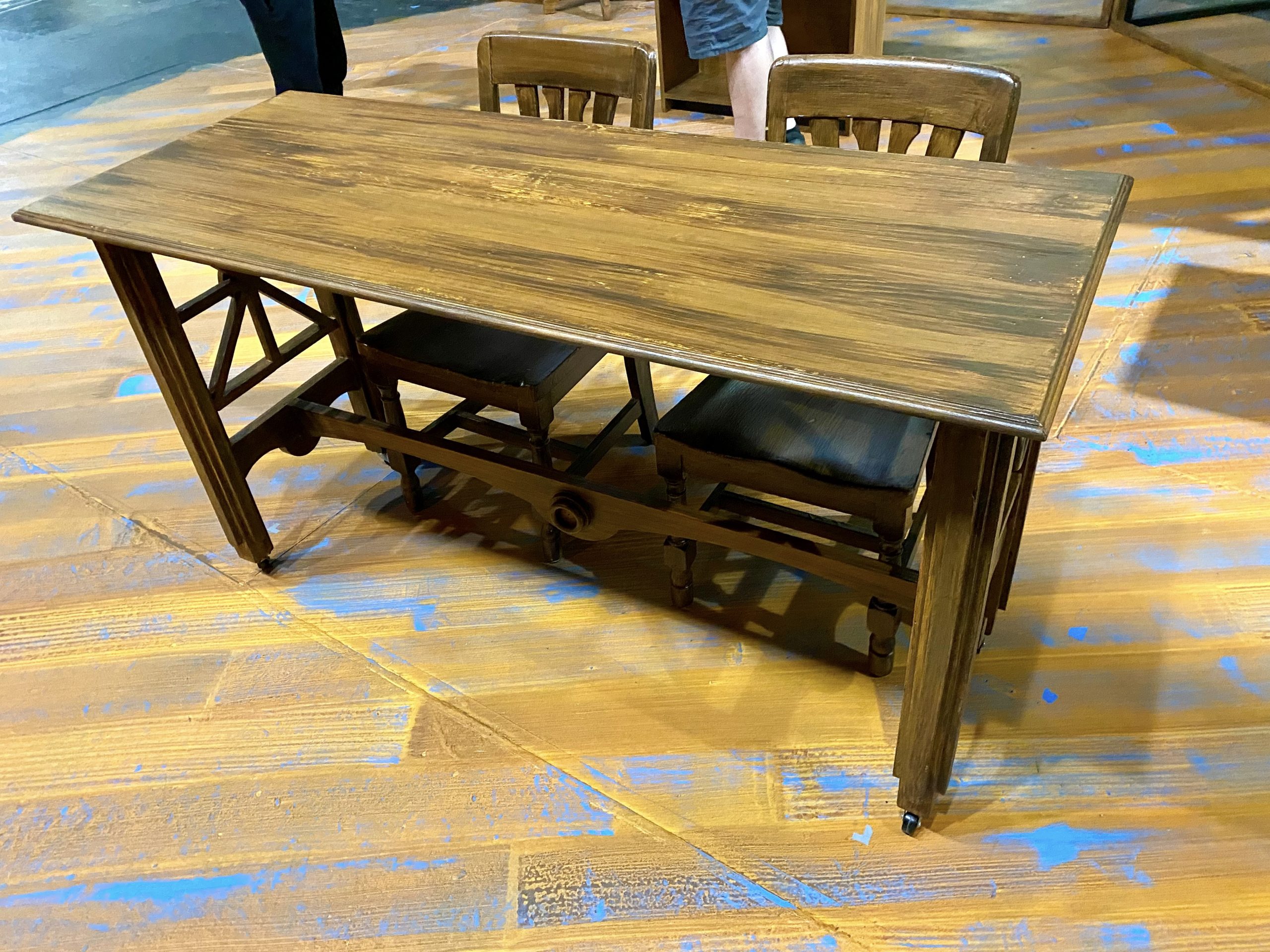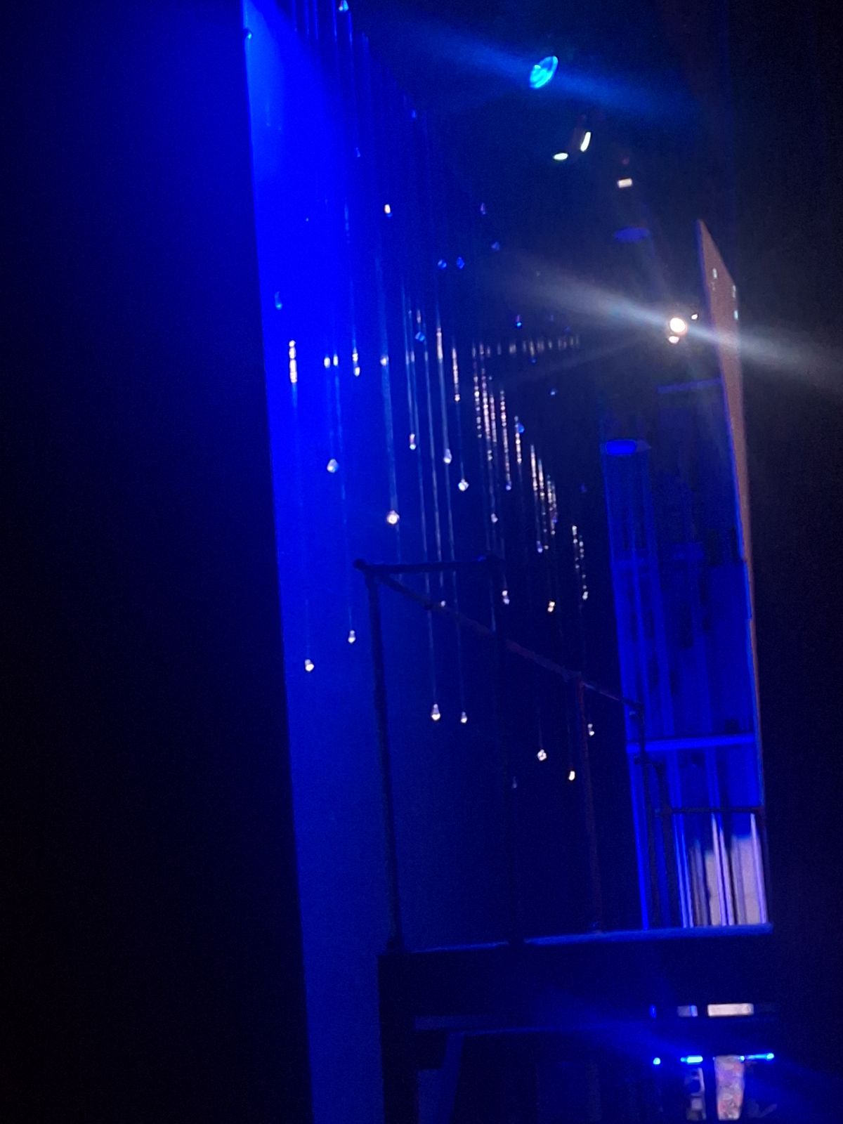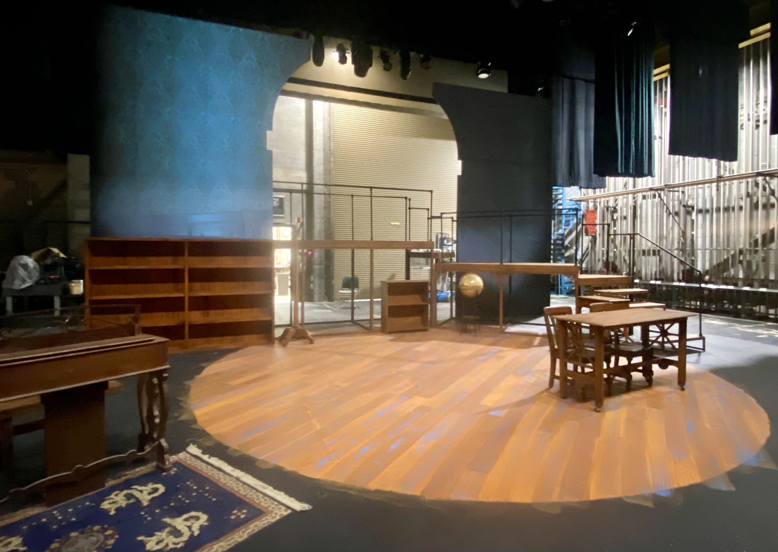 Under the Technical Director, I collaborated with the set designer, scenic technicians, and supervised construction students to create scenic elements including: cutting and welding steel for platform supports; painting & rigging projection surfaces; painting furniture; build, paint and installation of platforms; installation of crystal drop. The corner details were 3D printed, then painted. Scenic Painting students, including myself, collaborated to paint the stage floor as a class project.