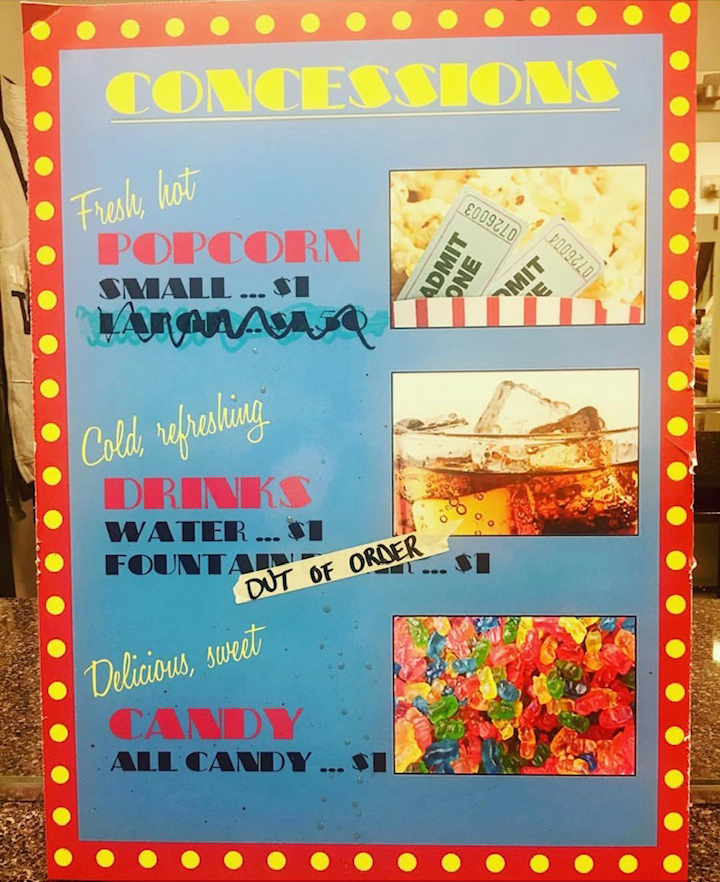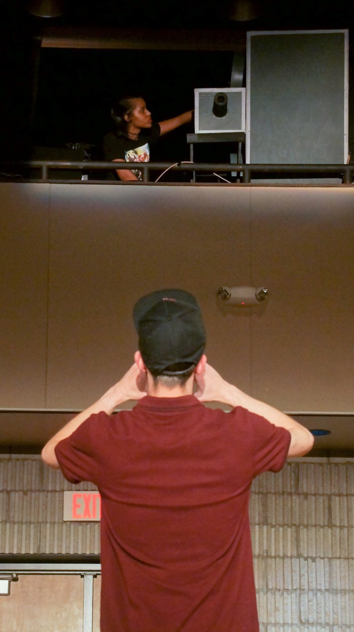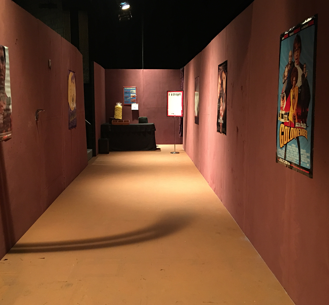 For this unique production, the actors used the theatre house and the booth as their stage. The audience entered through the back stage door, down a constructed movie hallway littered with out dated posters, past the concession stand (manned by myself in matching theatre employee costume), and took their seats under the proscenium. I was the properties designer, scenic charge artist, concessions & house manager. I worked with the carpentar the build a 35mm film projector with removable film reels. The entrance hallway was deliberately shabby, and I painted the stage floor to match the carpet in the auditorium. The college graphics department printed my concession sign which I prompltly and happily distressed. Janitorial staff allowed us to use their trash bin and brooms. I designed and printed the book cover at home, adhereing it to an old paperback from props storage.